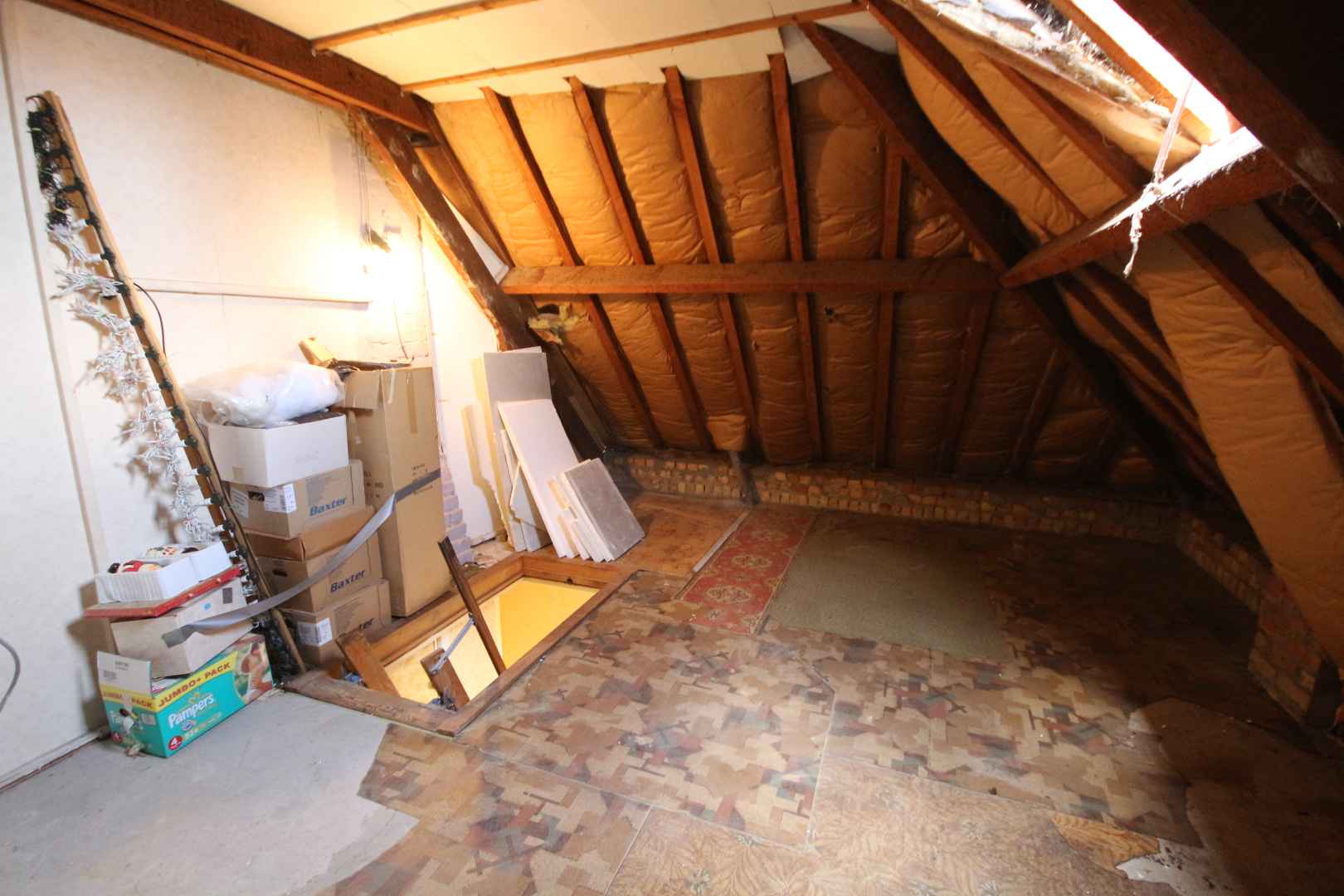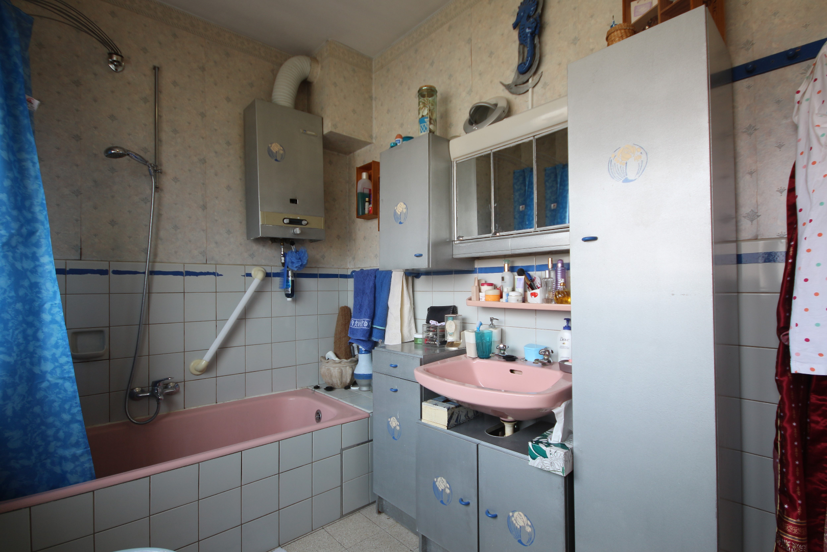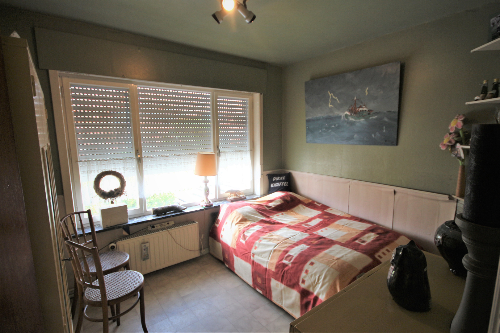 - 1ste en zolderverdieping: overloop + inbouwkasten en zolderluik & schuiftrap,- ruime voor-slaapkamer + loggia (5,55 x 4),- achter-slaapkamer (3,45 x 2,90),- bergplaats (2,20 x 1,60),- badkamer met ligbad, toiletmeubel + lavabo, w.c., en gasgeiser,- en zolder met 2 bergruimtes + 2 vlakdakramen.
