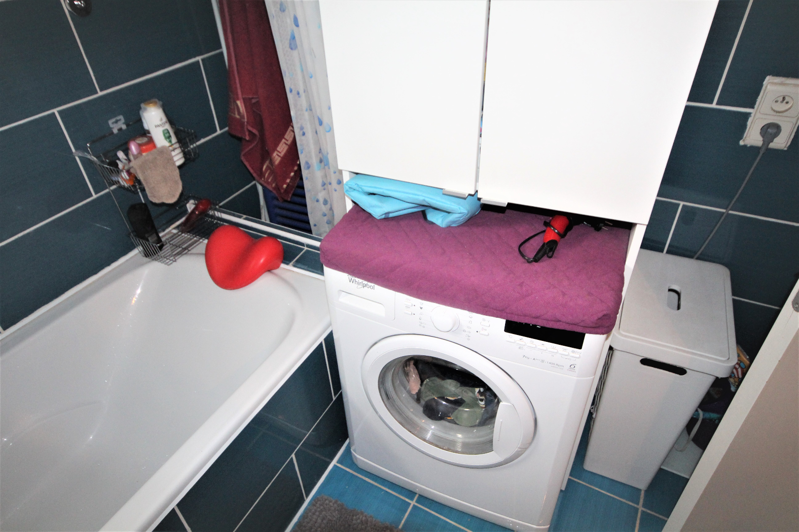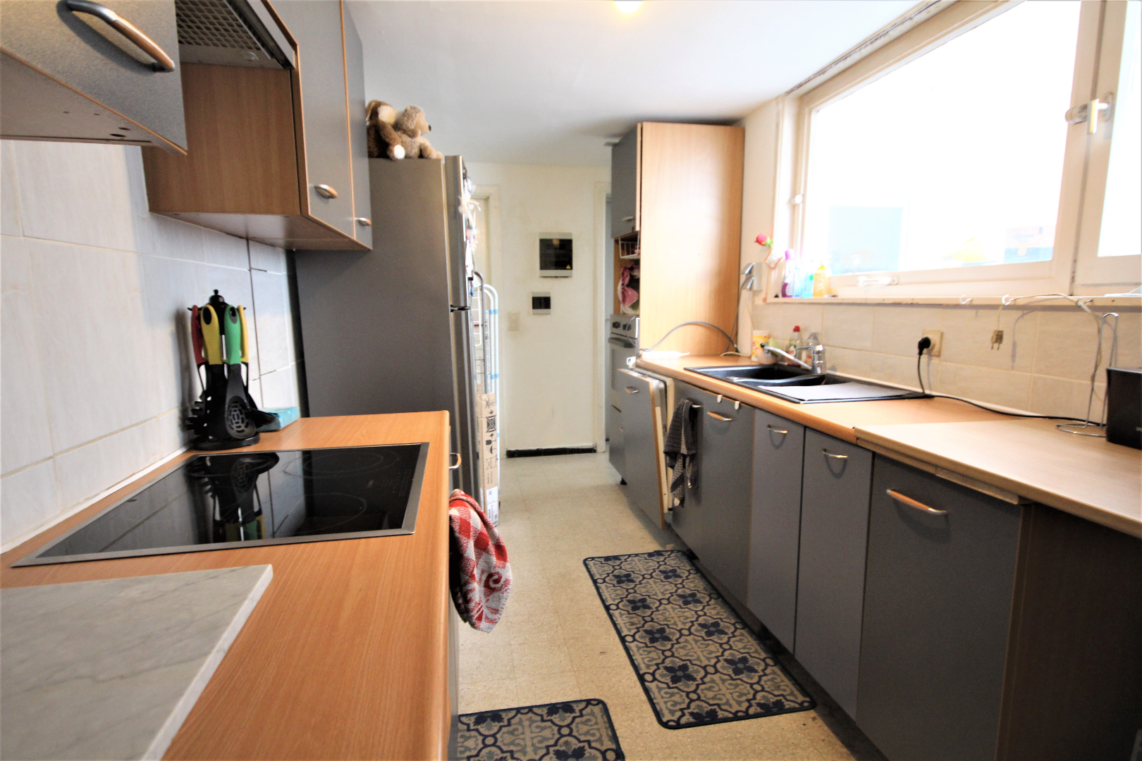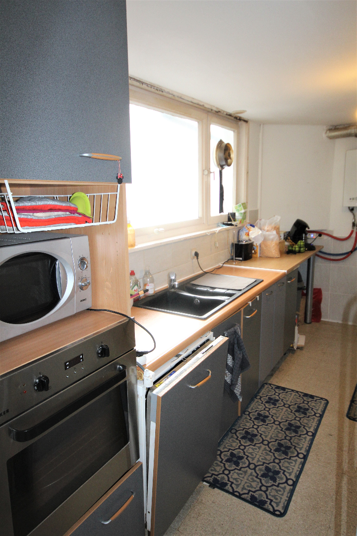 a) gelijkvloers: inkom- & traphal met trap in beuk, vestiaire en ingemaakte kast met tellers van aardgas, water, en elektriciteit,- woonkamer (27 m²) met salon + living,- aansluitende keuken (4,15 x 2,25) met keukenblok + ingebouwde warme-luchtoven, vaatwasautomaat, en dubbele afwasbak * 2de keukenblok + ingebouwde keramische kookplaat, en dampkap (+ aardgasgeiser & zekeringskast),- nieuwe badkamer met w.c., ligbad, toiletmeubel + ingebouwde lavabo, handdoek-radiator, en aansluiting voor wasautomaat (mooie faience),- zonnige en betegelde koer (40 m²) + bergplaats ;