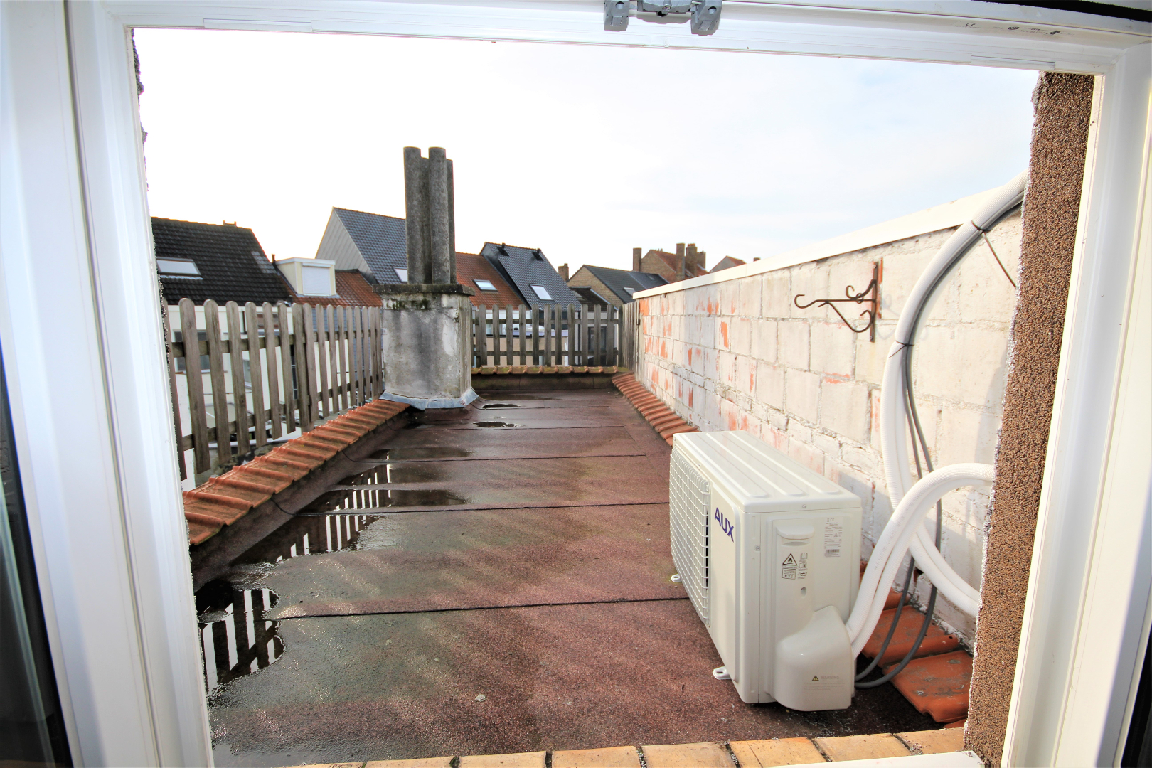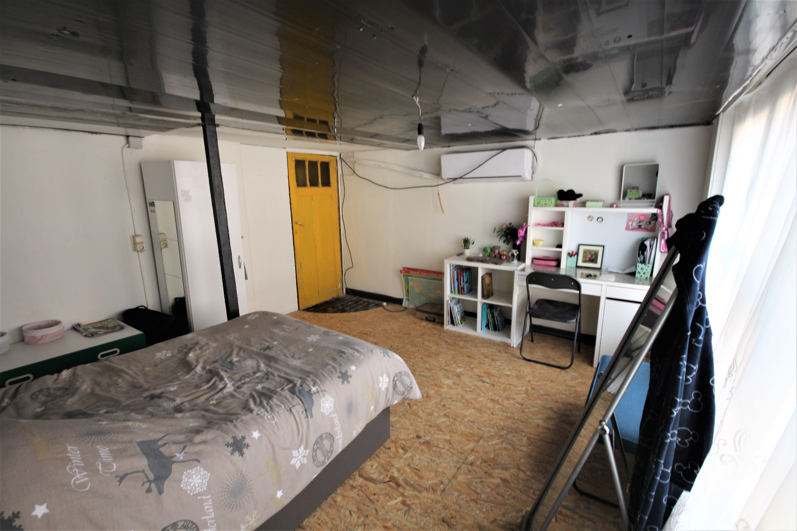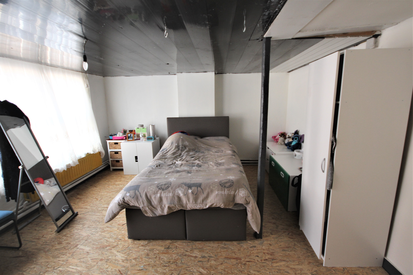 c) tweede verdieping: platform + airco-unit,- palier,- voor-slaapkamer (4,65 x 3,78) met airco,- en zolderbergplaats (4,35 x 3) met aardgas-wandgenerator Bulex en veluxraam.