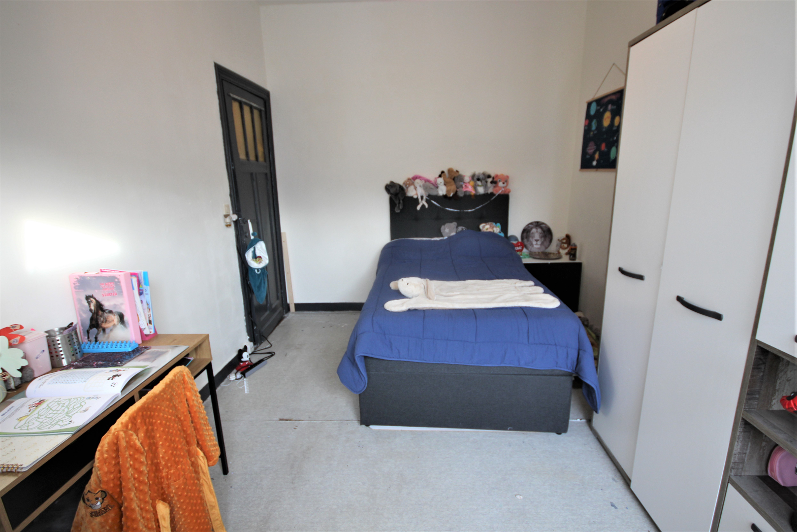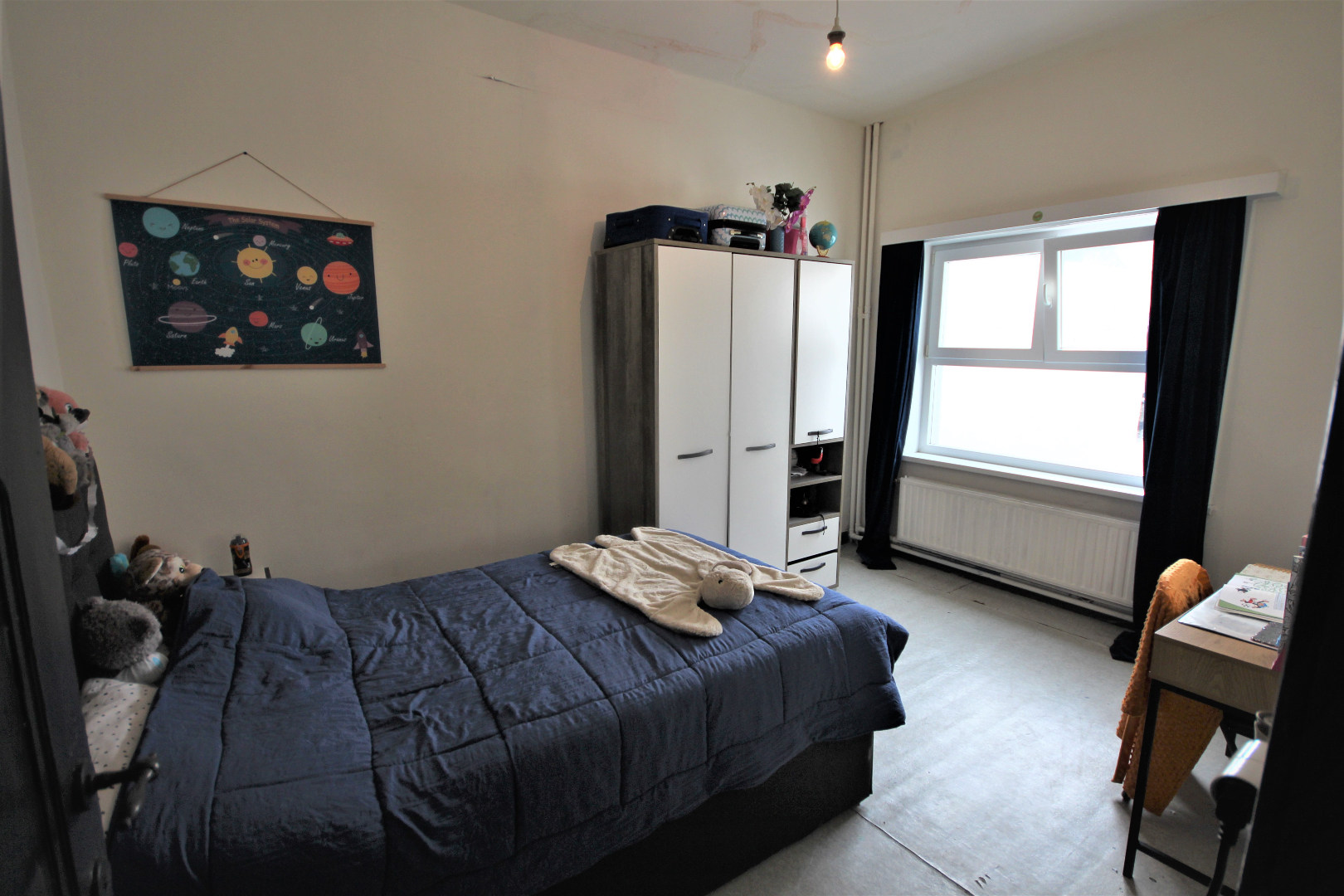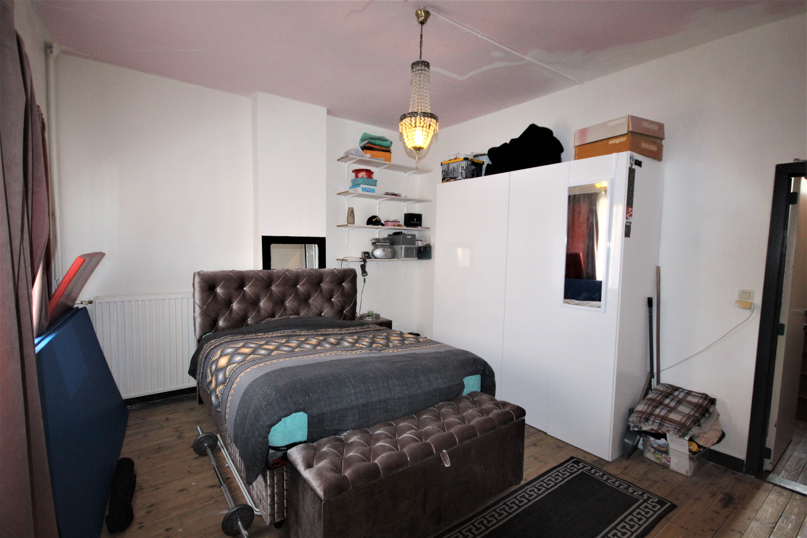 b) eerste verdieping: tussenverdiep + sas & ingemaakte kast,- slaapkamer (4,10 x 2,25) + aansluitende badkamer met w.c. en in-loop-douche (nieuwe faience),- palier,- voor-slaapkamer (4,65 x 3,80),- en achter-slaapkamer (4,25 x 3) ;