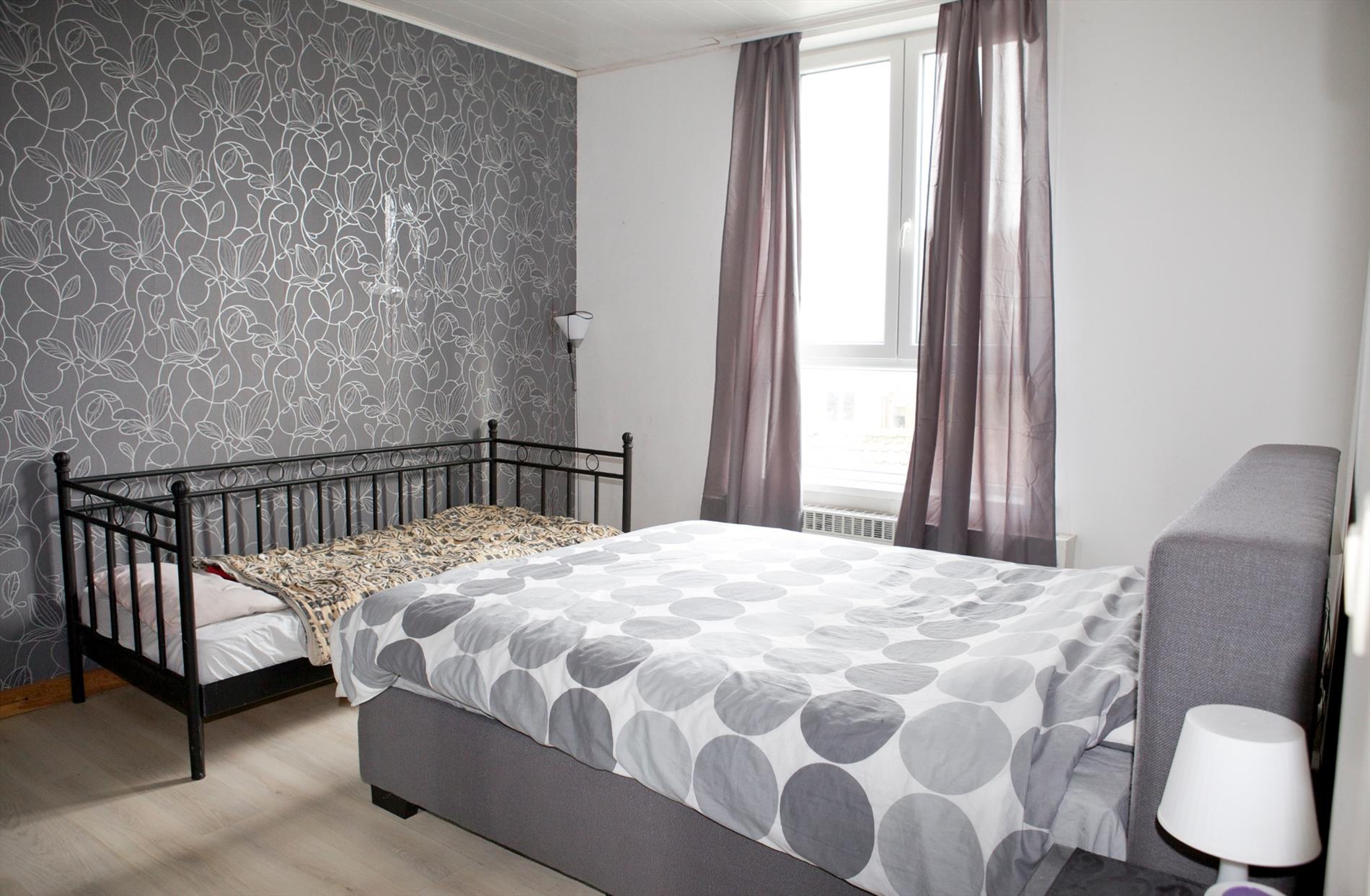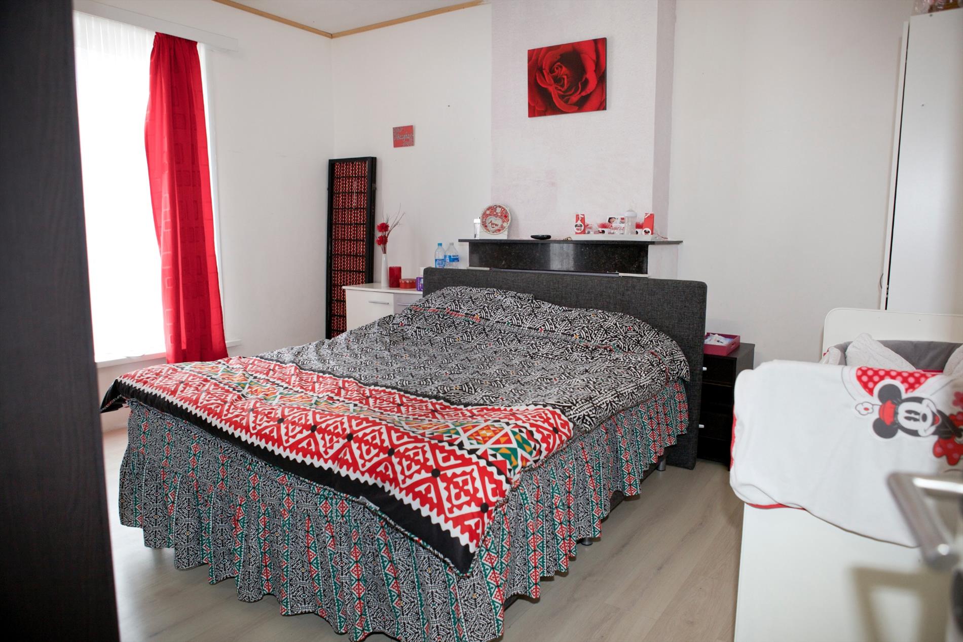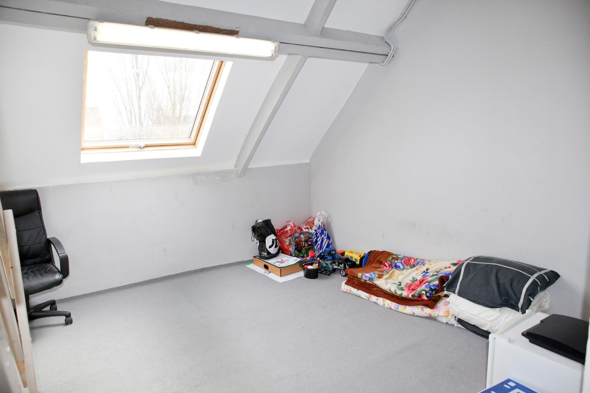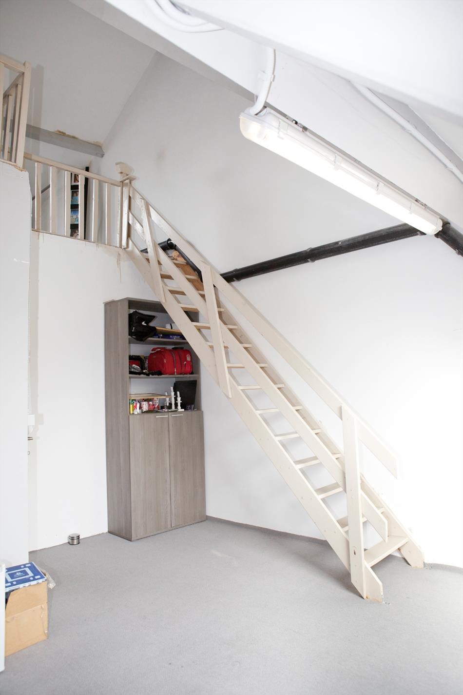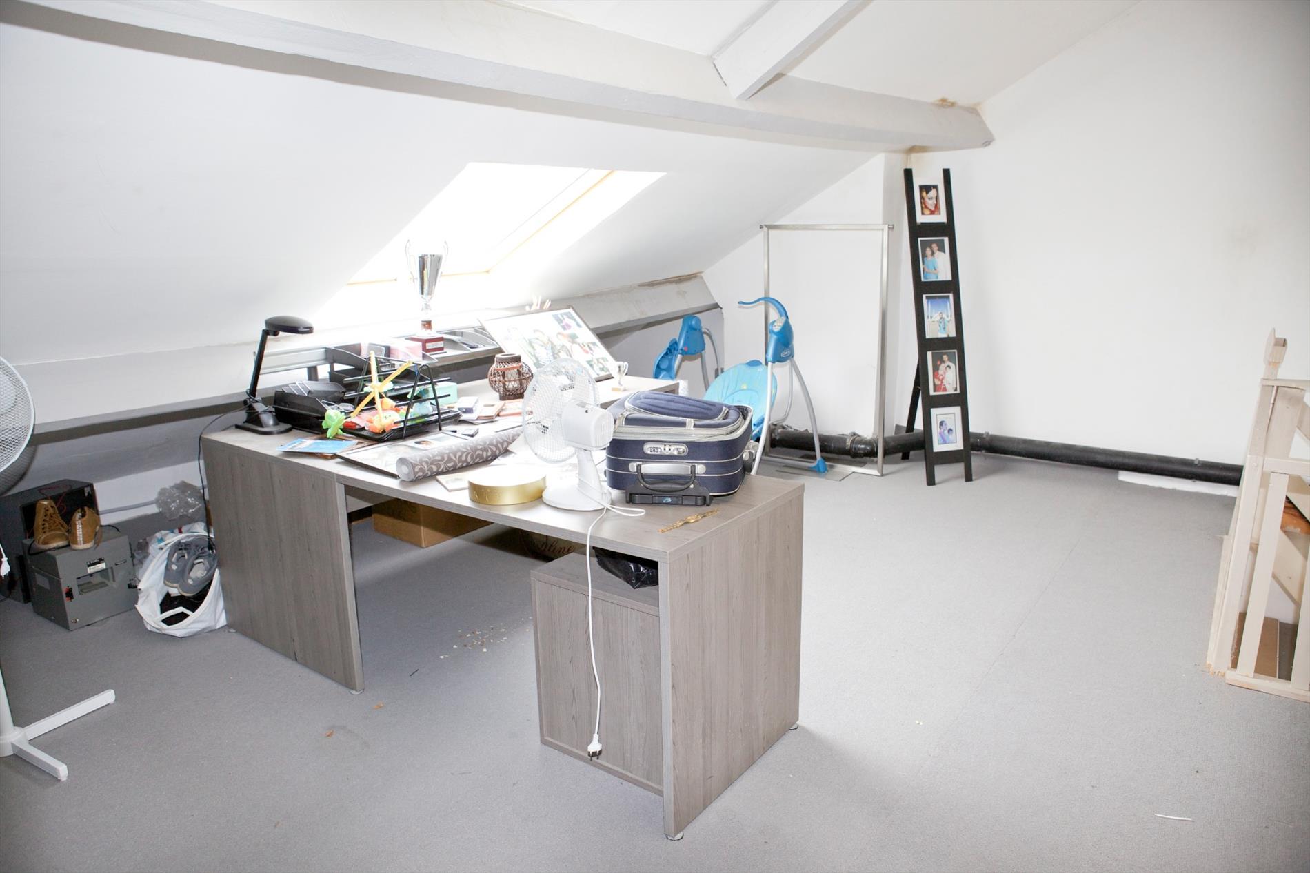 d) 2de & zolderverdiep: overloop,- voor-slaapkamer (5,49 x 2,30) + elektrische boiler,- 2de voor-slaapkamer (4,58 x 2,94) + ingemaakte kasten,- en zolder +opperzolder .