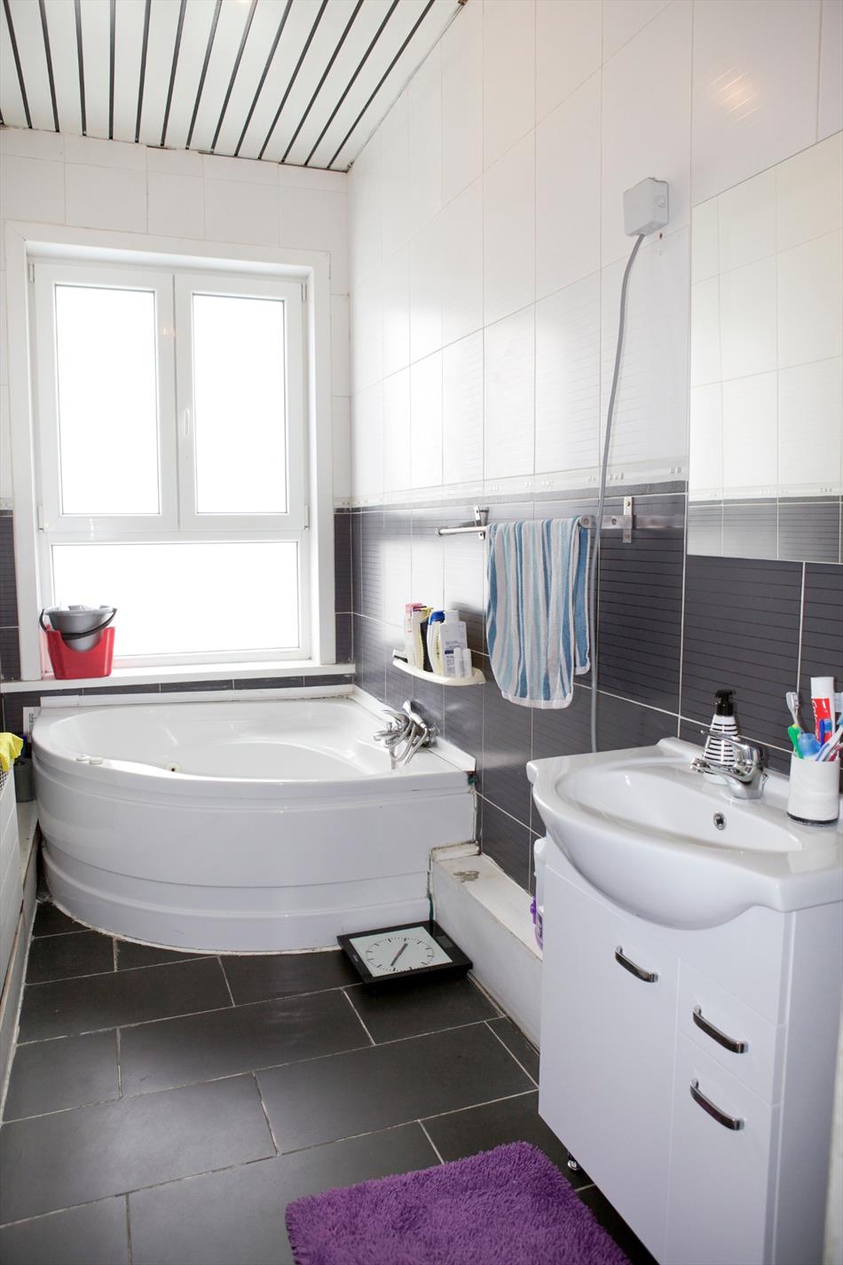 c) 1ste verdiep: overloop + w.c.,- overloop,- achter-slaapkamer (4,51 x 3,70),- badkamer (3,47 x 1,58) met ligbad, en dubbele lavabo,- en voor-slaapkamer (4,51 x 3,66) ;