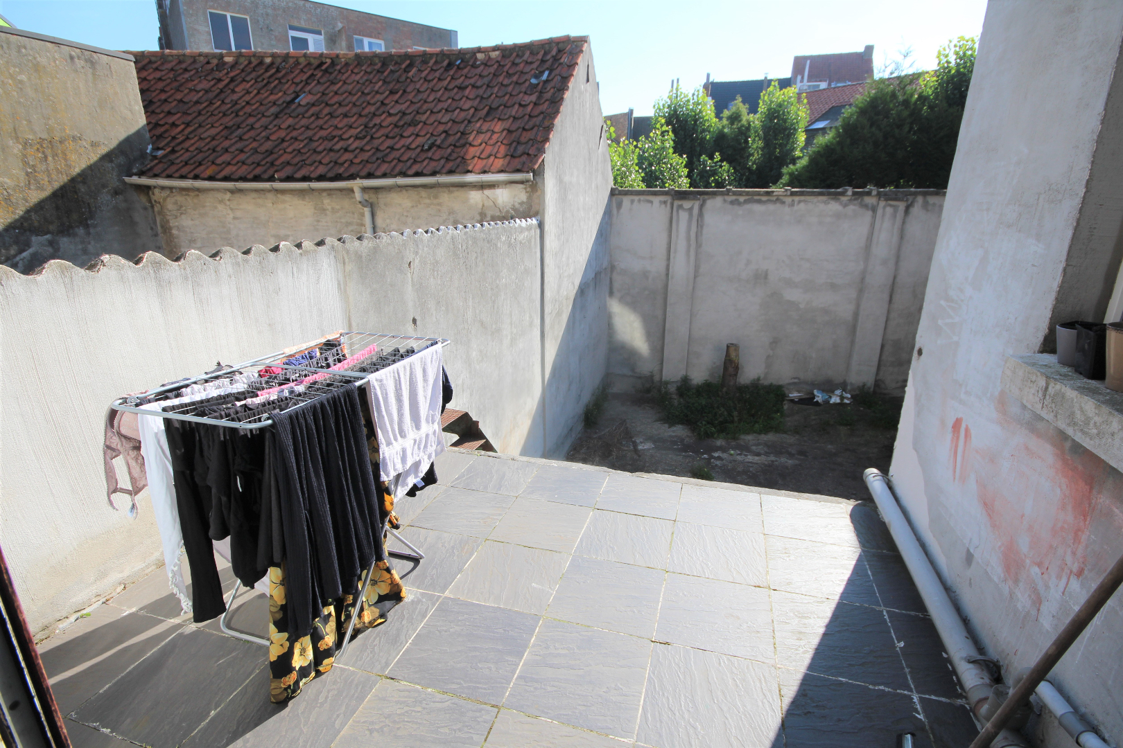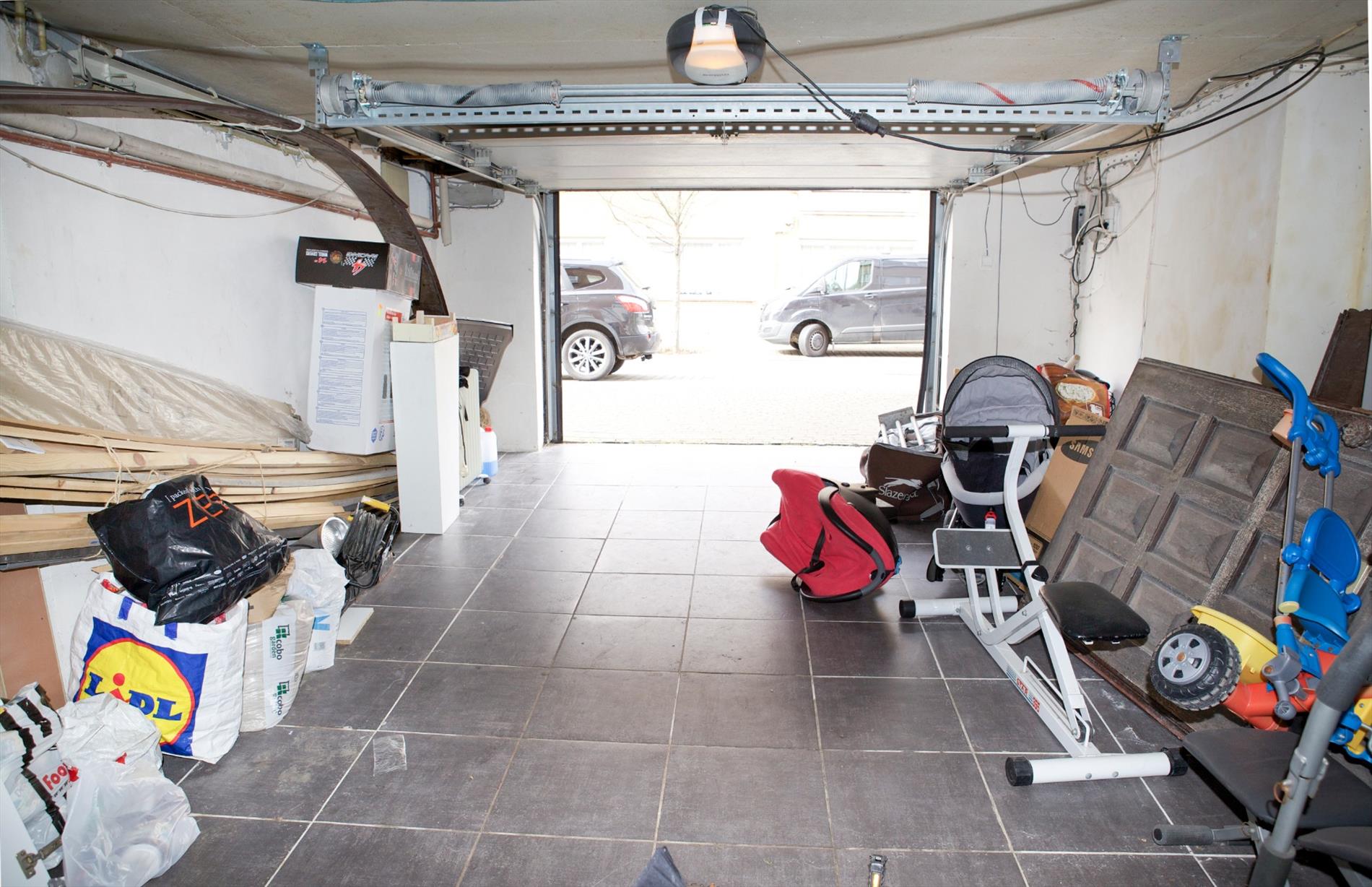 b) souterrain: garage (5,08 x 3,89) + elektrische sectionale poort,- gang met gas- en elektriciteitsteller,- koolkelder met waterteller,- stook- & wasplaats met c.v.-generator & gasgeiser,- ateliertje (7,74 x 3,04),- en tuintje (5,50 x 8,25) ;