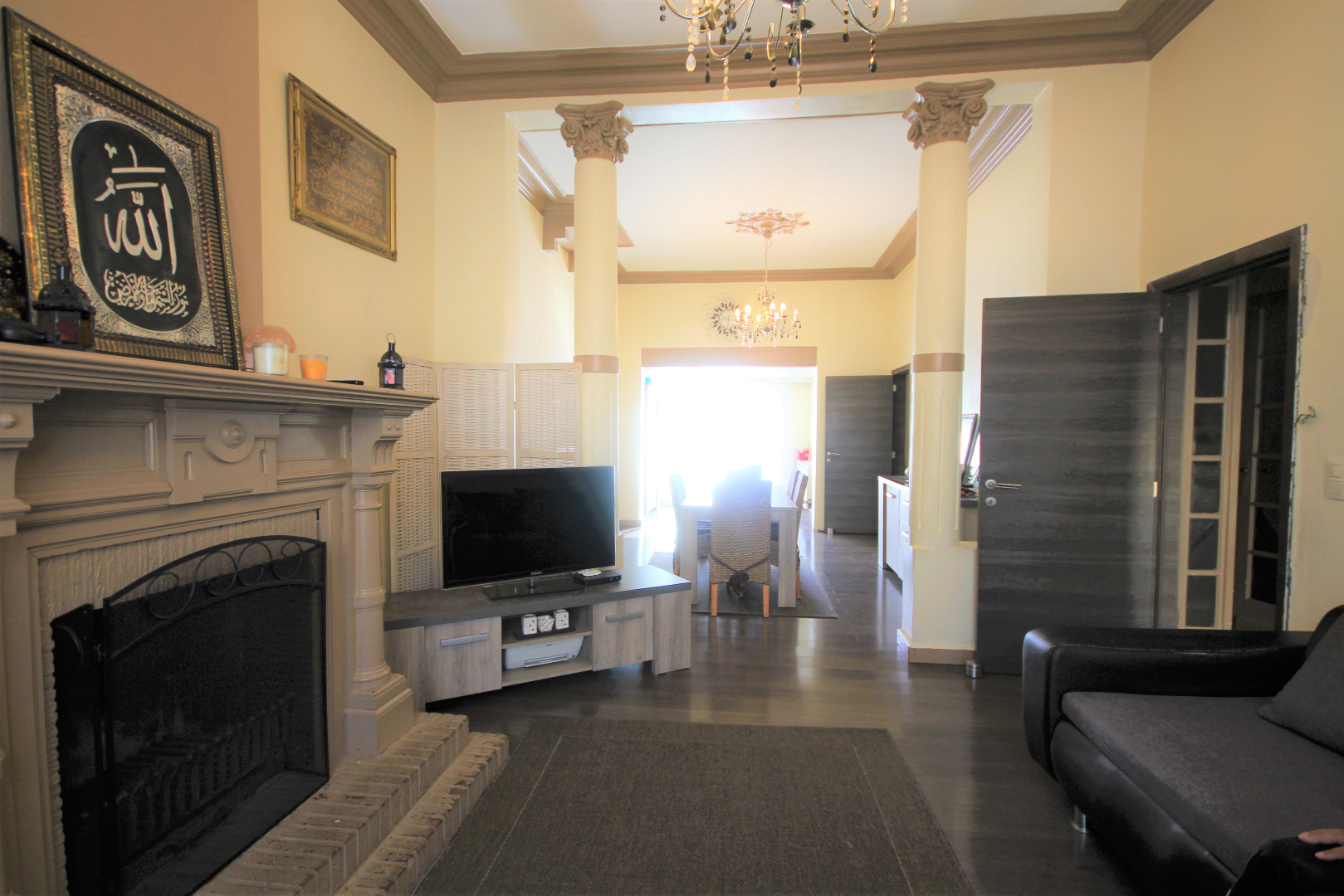 a) bel-étage: statige inkomhall + marmeren trap & gang,- indrukwekkende living (37 m²) met rustieke sierschouw-openhaard,- aansluitende veranda,- terras (2,57 x 3,14) + metalen buitentrap,- annexe-keuken (4 x 2,47) met L-vormige keukenblok (onder- en bovenkasten in grijze meubelplaat) + ingebouwde aardgas-kookplaat, oven, dampkap, frigo, en afwasbak (aansluiting voor vaatwasautomaat) ;