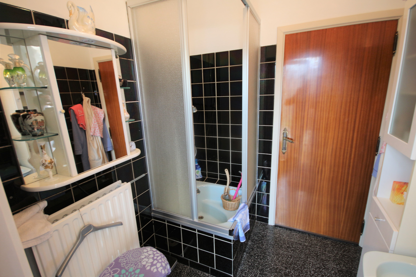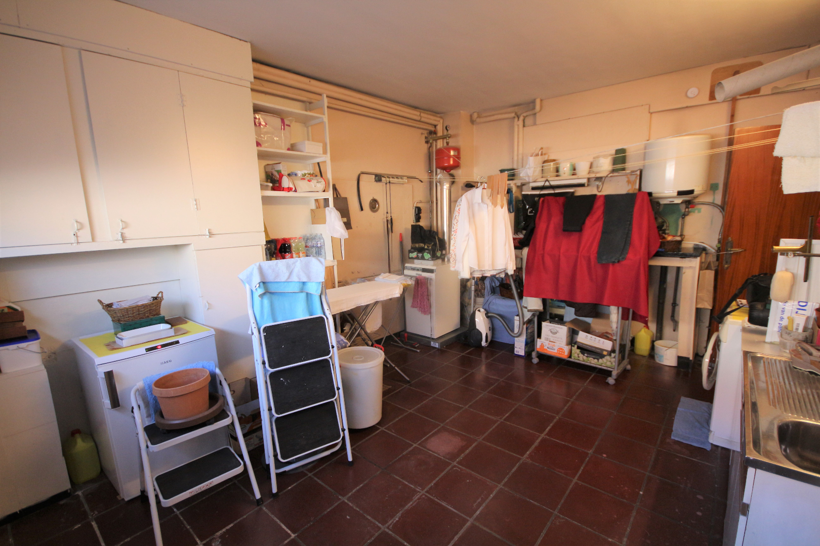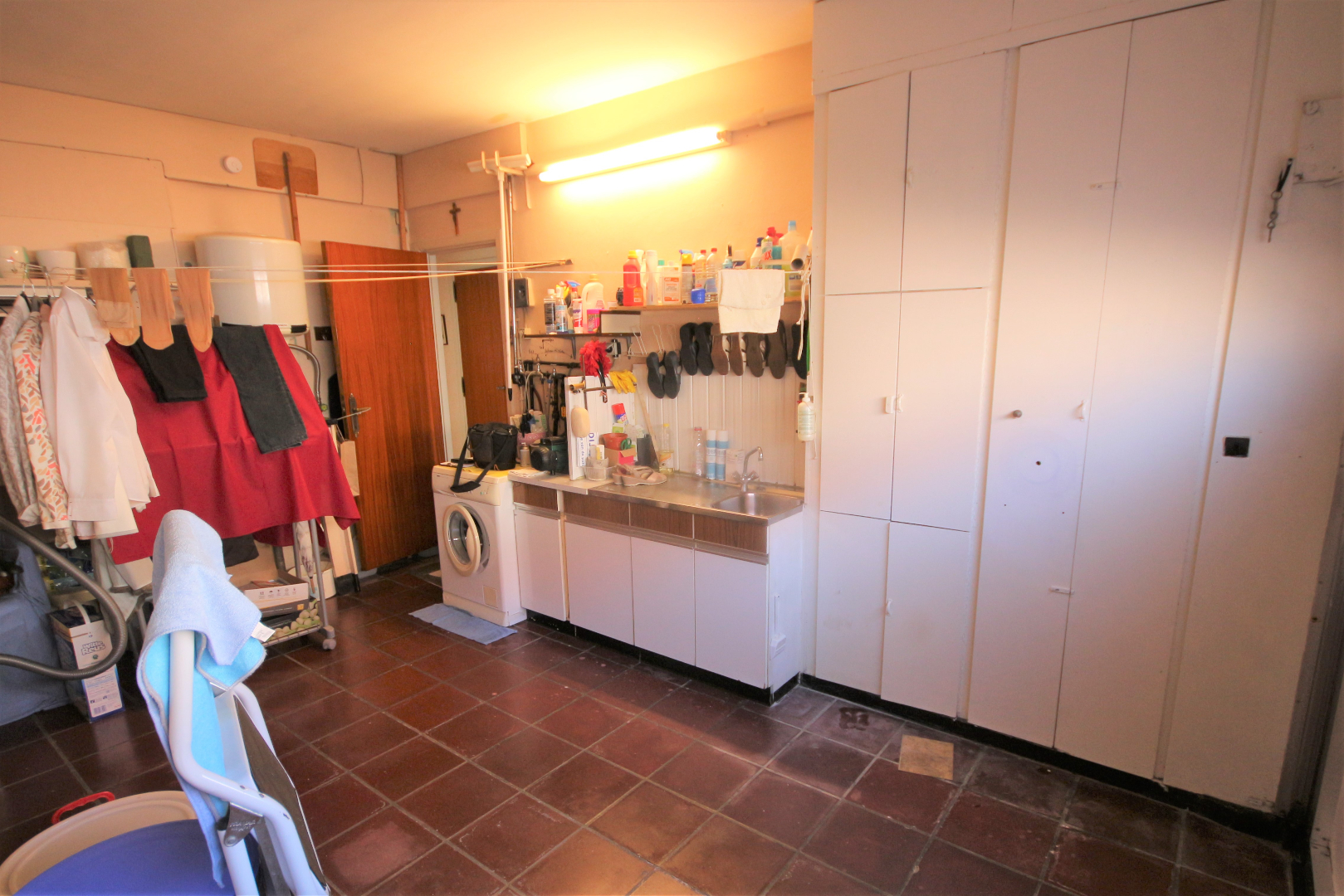 a) gelijkvloers: inkom- & traphall met vloer en trap in granitosteen (+ smeedijzeren balustrade),- kelder (met dompelpomp),- toilet met w.c. & lavabo,- garage (5 x 3,75) met kantelpoort in alu, elektrische boiler, c.v.-aardgasgenerator, reeks ingemaakte kasten, onderkast + inox afwasbak, hydrofoor, en aansluiting voor wasmachine,- slaapkamer (3,60 x 3,29),- badkamer met douche en lavabo,- sas-veranda,- zonneterras,- en ommuurd & zonnig-georiënteerd tuintje + tuinhuis ;