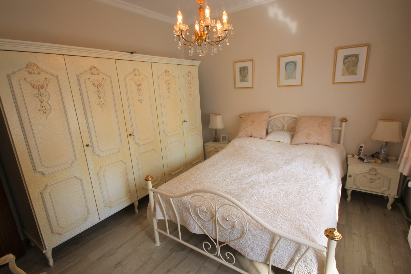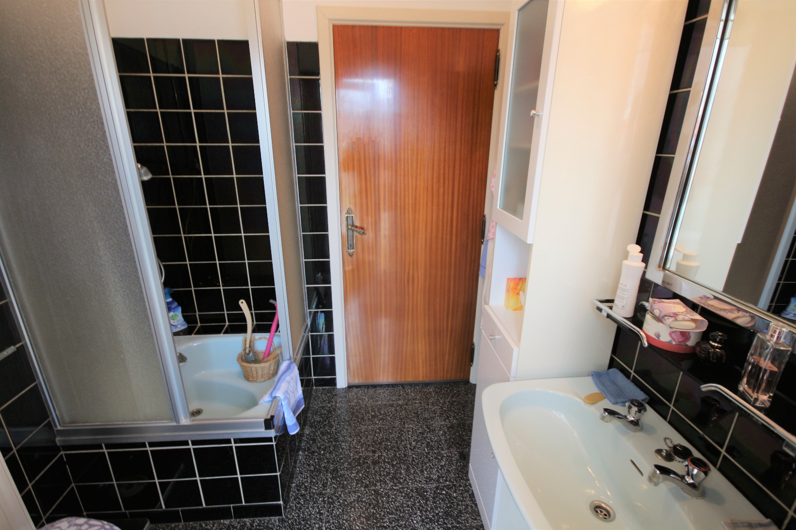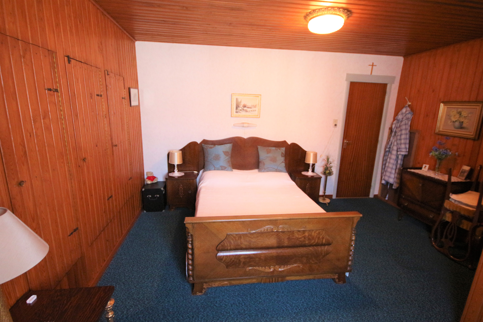 a) gelijkvloers: inkom- & traphall met vloer en trap in granitosteen (+ smeedijzeren balustrade),- kelder (met dompelpomp),- toilet met w.c. & lavabo,- garage (5 x 3,75) met kantelpoort in alu, elektrische boiler, c.v.-aardgasgenerator, reeks ingemaakte kasten, onderkast + inox afwasbak, hydrofoor, en aansluiting voor wasmachine,- slaapkamer (3,60 x 3,29),- badkamer met douche en lavabo,- sas-veranda,- zonneterras,- en ommuurd & zonnig-georiënteerd tuintje + tuinhuis ;