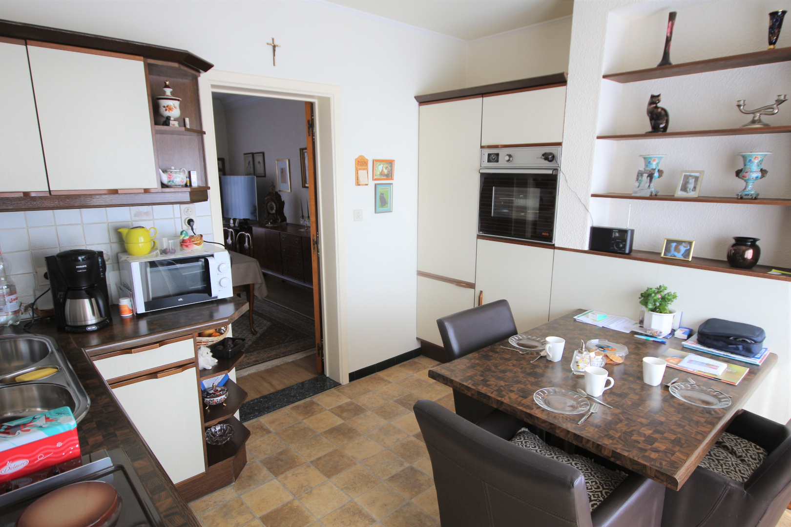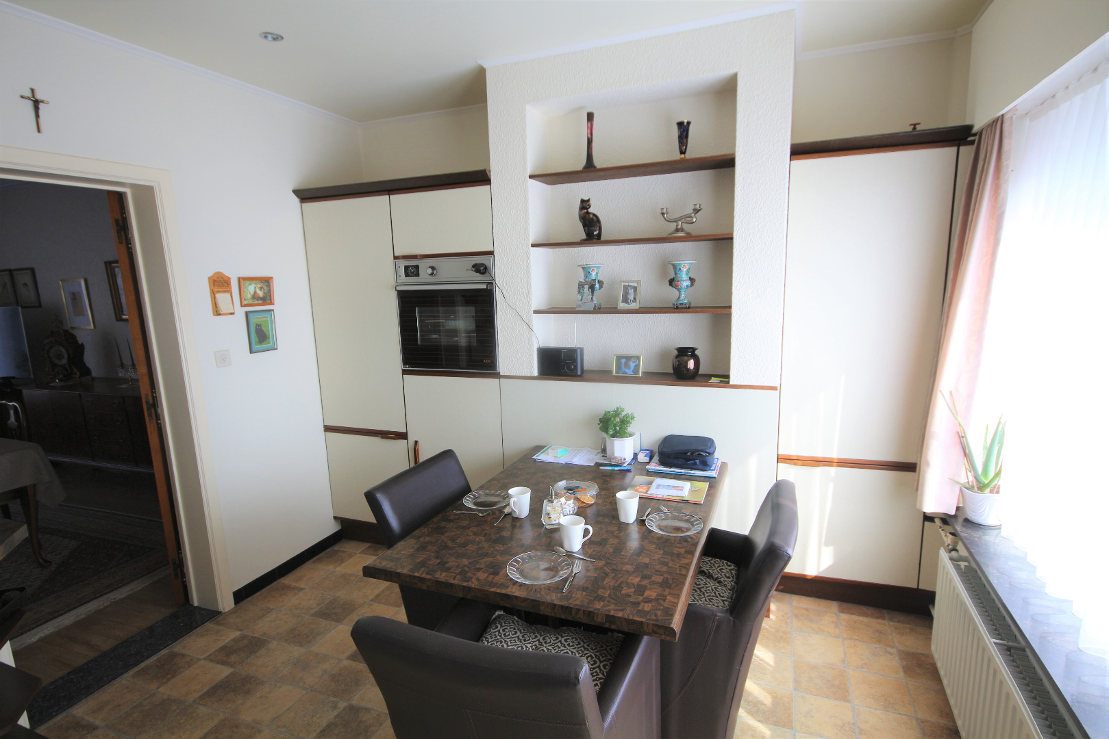 b) 1-ste & zolderverdiep: overloop,- living (27 m²) met videofoon en sierschouw in carrara marmer & sfeerhaard,- keuken (3,58 x 3,25) met L-vormige keukenblok onder- en bovenkasten in witte meubelplaat + dubbele inox afwasbak, elektrische kookplaat en dampkap. In de keuken is er spanplafond + inbouwspotjes; * 2de keukenblok met reeks kasten + ingebouwde oven en nieuwe frigo,- zonneterras (5,70 x 1,03) + zonnetent,- traphall (2,45 x 1,97) met ingemaakte kasten, en beuken trap,- * zolder-slaapkamer (4,20 x 4,25) + ingemaakte kasten, en standvenster,- zolderhall (3,55 x 1,80) en zolderberging + Velux.