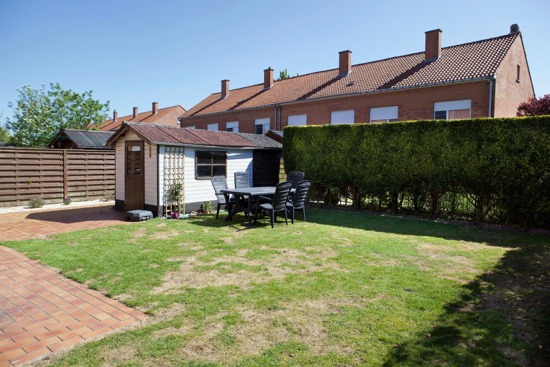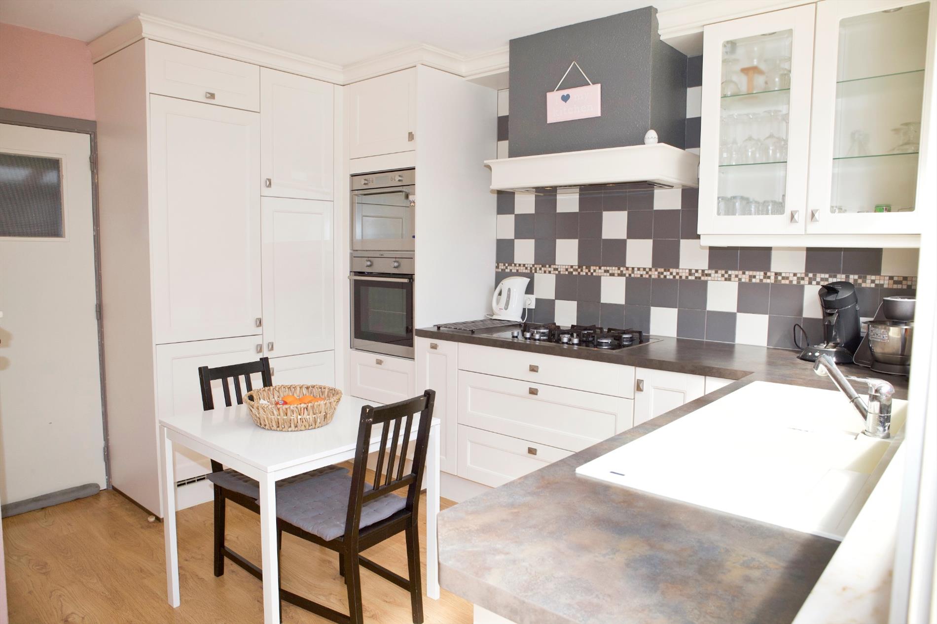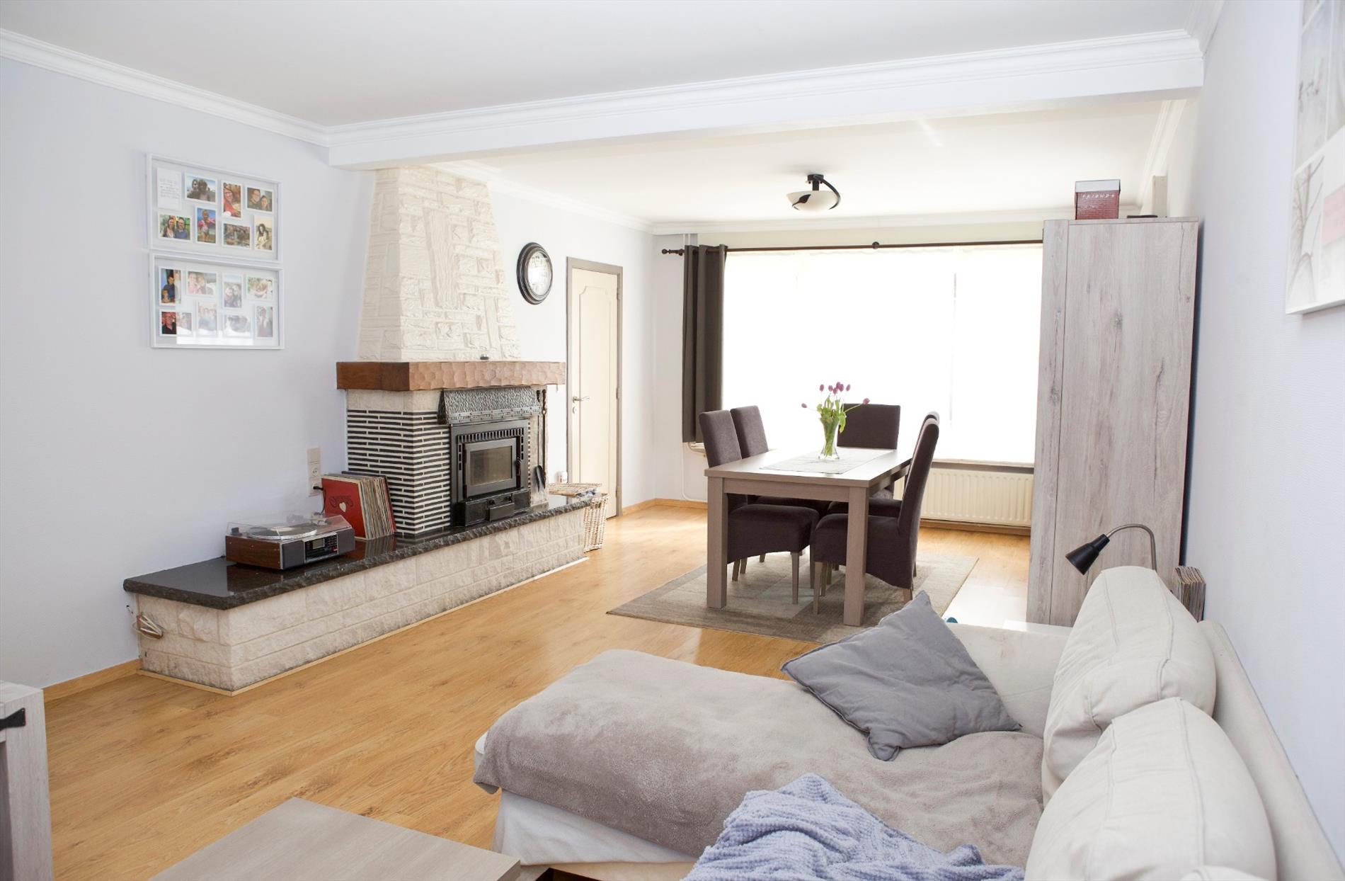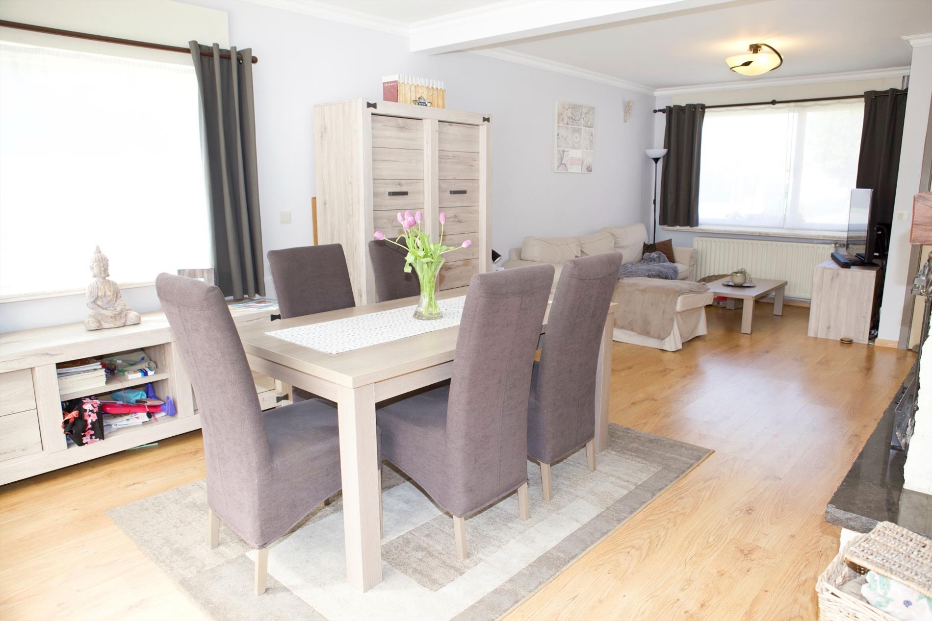 - Gelijkvloerse verdieping met : hall (trap in hout),-luchtige woonkamer (7,90 x 3,95) met sierschouw + granieten tablet en inbouwcassette (hout),- vernieuwde keuken (3,20 x 3,70 * in landelijke stijl) met van U-vormige keukenblok voorzien van onder -en bovenkasten+laden, werkblad, dubbele spoelbak in kunststof, en toestellen van AEG: vaatwasautomaat, hete-luchtoven, microgolfoven, 5 gasbekkens, dampkap, koelkast, diepvriezer,- berging (1,30 x 1) met recente CV ketel,- garage (5 x 2,70) met geïsoleerde kantelpoort, nieuwe hydrofoor, aansluiting wasautomaat,- vernieuwd toilet met hang-w.c.,- keldertje met gasteller,- veranda (2,60 x 8,20 * te renoveren) met aansluiting wasmachine,- zeer zonnige tuin (zuidoost/zuid gericht) met houten poortje, omheind met hagenbeuk en tuinhuis,- terras en voetpad in tegels (+/-36 m²),- oprit (+/-20 m²) ;