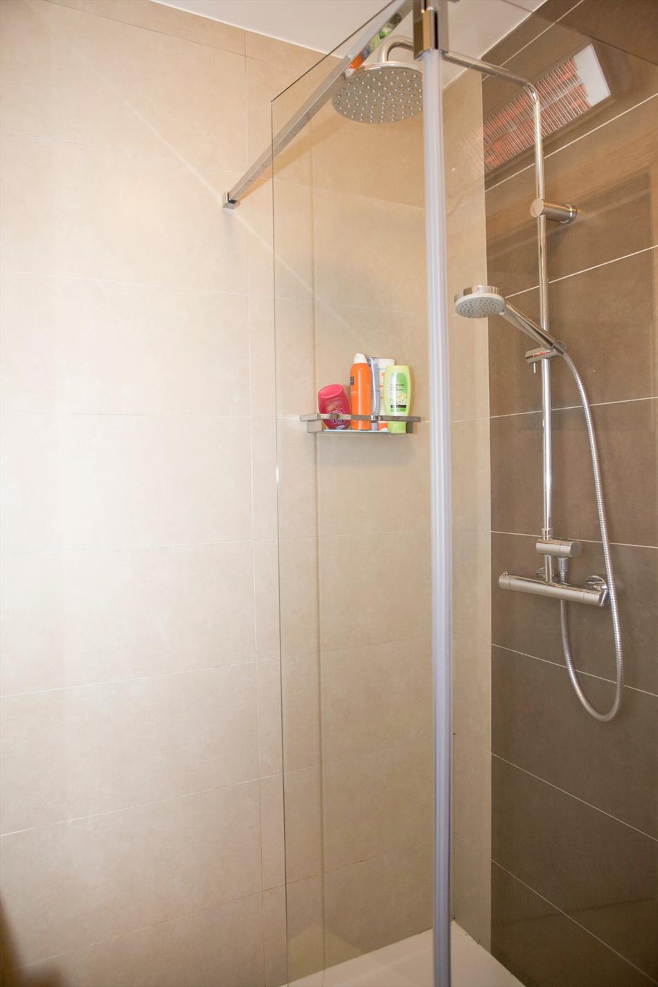 - Eerste verdieping : overloop met zolderluifel,- vernieuwde badkamer met wasmeubel + spiegelkast en 2 wastafelmengkranen ‘Grohe’, inloopdouche + glazen wanden en badkamerkachel,- 2 voor-slaapkamers (5 x 2,70 * 4 x 2,90),- 2 achter-slaapkamers (3,80 x 3,90 * 3,65 x 3,70) ;