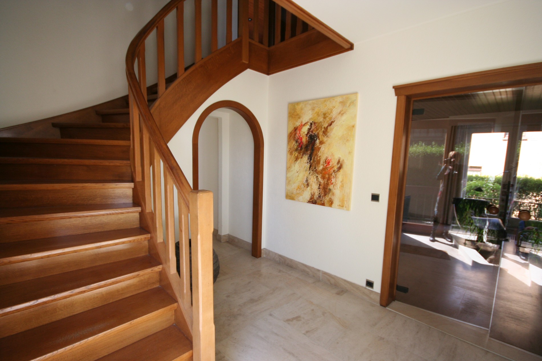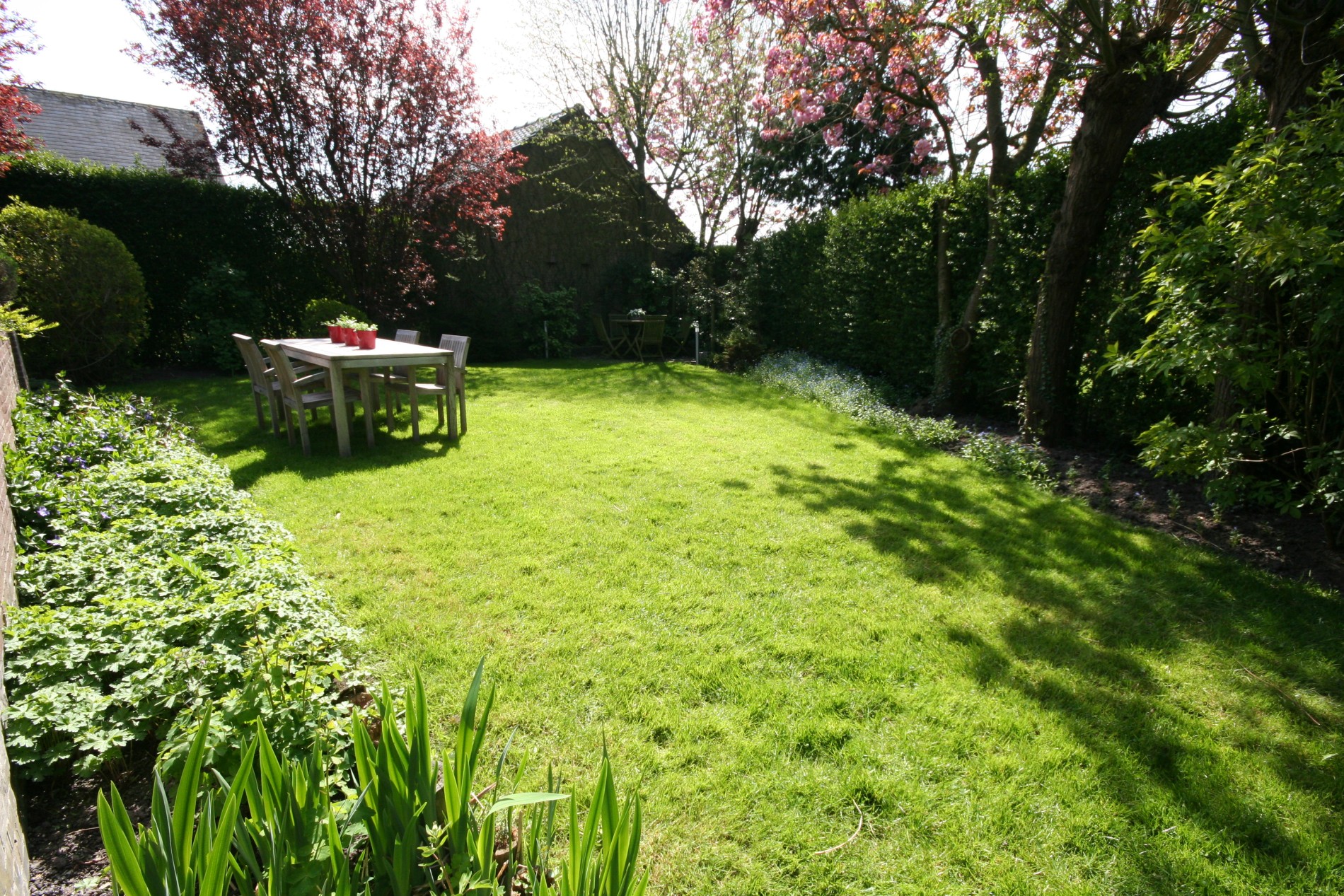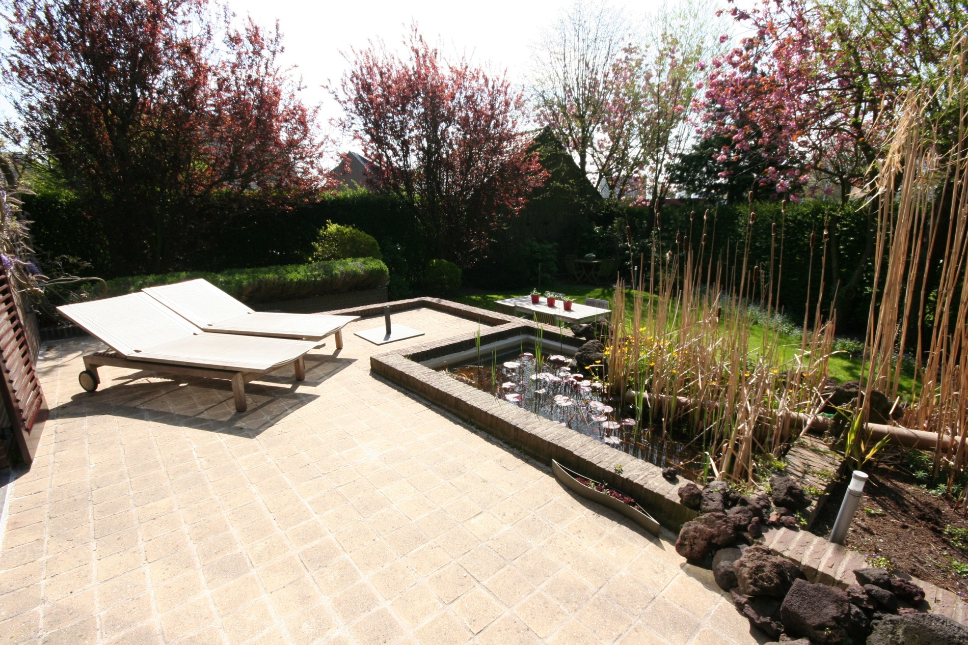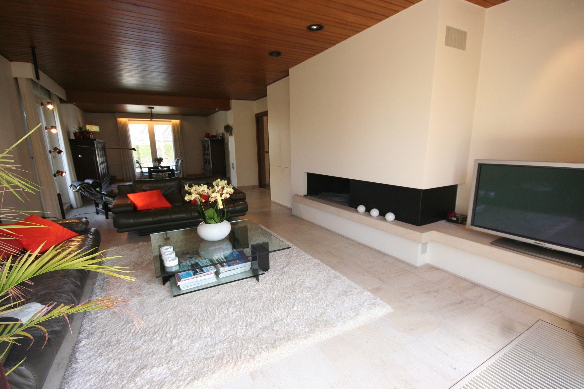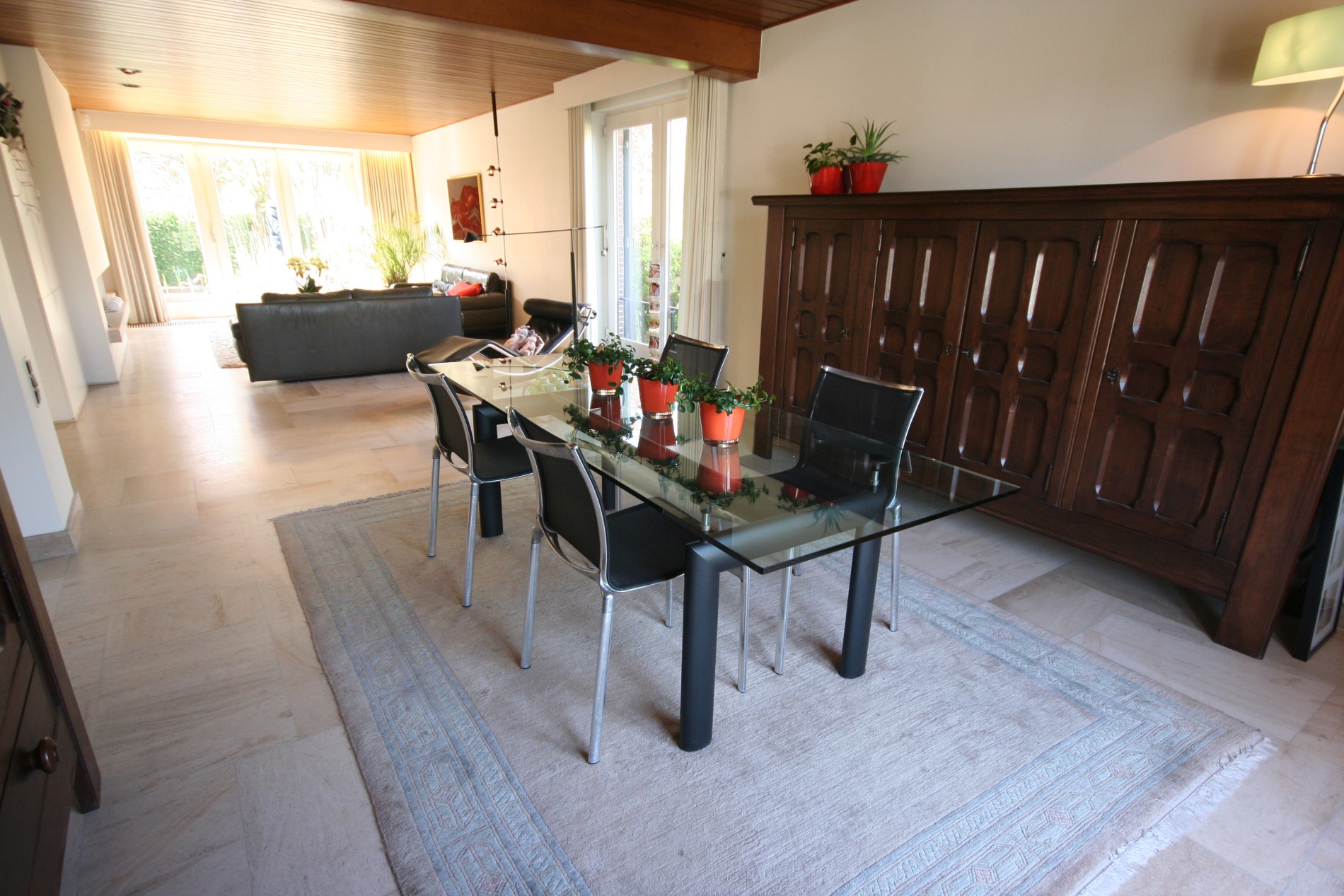 a) gelijkvloers: Inkom- & traphall (9 m²) met voordeur (+ gewapend glas), en vestiaire (dubbel glazen deur naar living * trap in eik),- toilet met w.c. + lavabo (nieuwe faïence),- ruime en nieuw-ingerichte living (12 x 4,50) met design-openhaard + diverse aanbouwkasten (eiken plafond + inbouwspotjes),- nieuw ingerichte keuken (11 m²) met U-vormige keukenblok + ingebouwde ceramische kookplaat, inox hangdampkap, vaatwasautomaat, warmeluchtoven, koelkast, en dubbele inox afwasbak (toestellen van Miele * composiet werkblad),- verhoogd zonneterras met Koi-visvijver,- zonnige achtertuin (volledige privacy * met gazon & verzorgde beplanting) + groot tuinhuis,- stemmig voortuintje met visvijvertje,- en licht-dalende oprit ;