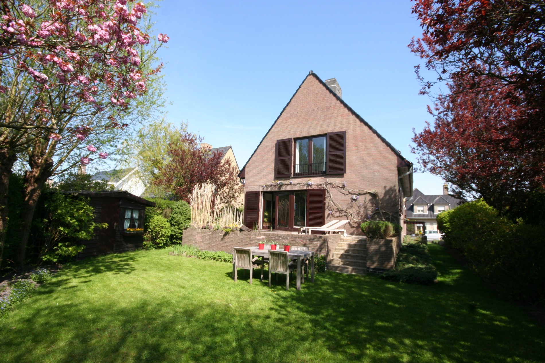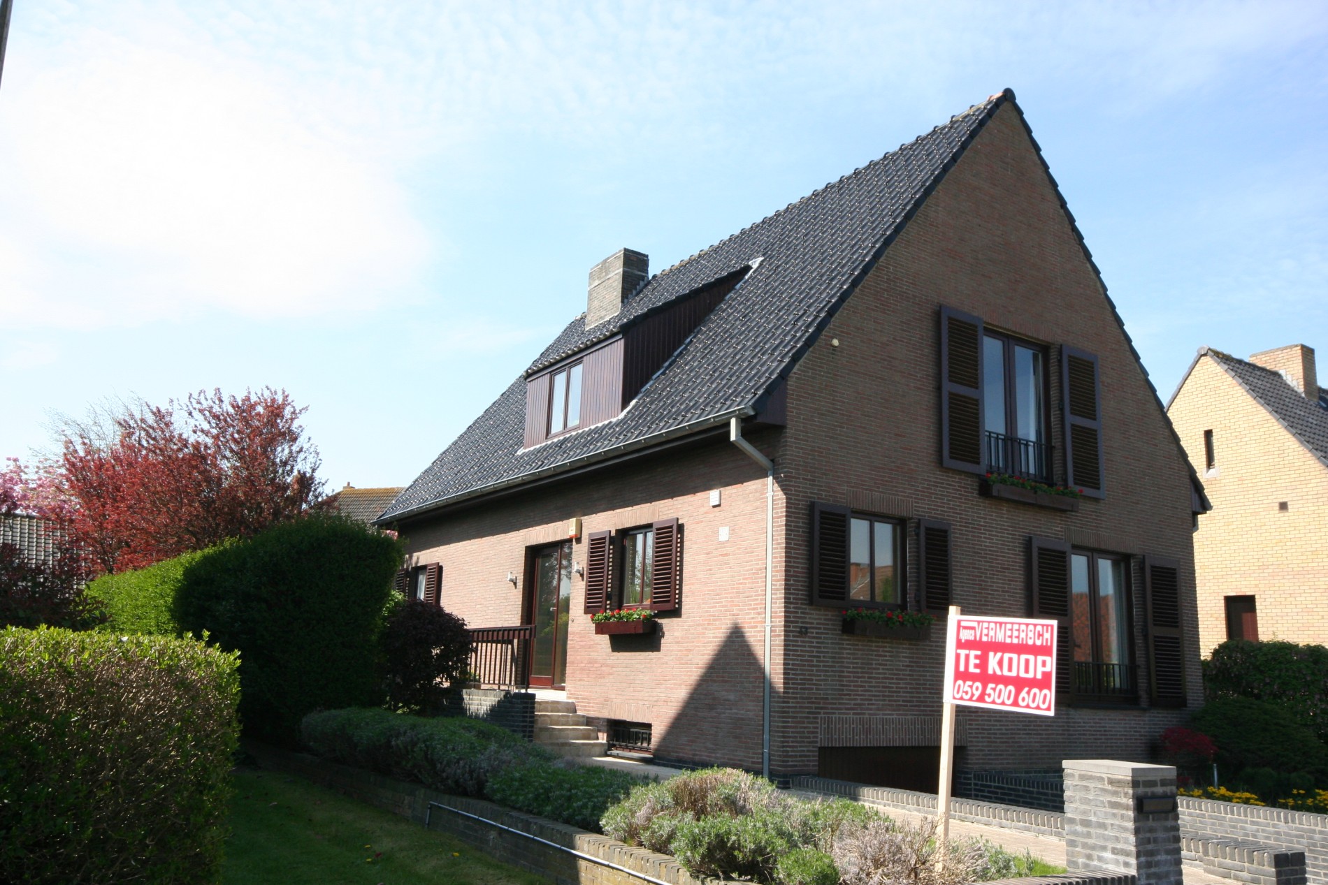 Verzorgde, volumineuse, en “in-stap-klare villa”, stevig en op traditionele wijze gebouwd in 1969, op een perceel bouwgrond met een breedte van 16 m. op een diepte van 36 m. Bebouwde oppervlakte: 100 m², benutbare oppervlakte: 280 m², bewoonbare vloer-oppervlakte: 200 m², en beschermd volume: 554 m³. Stevige funderingen (in gewapend steenslagbeton tot op vaste grond). Alle verdiepingen zijn voorzien van vloerplaten in gewapend beton, met daarop chape-afwerking. Verzorgde buitengevels, uitgevoerd in een paraments-metselwerk van bruine genuanceerde gevelbrieken. Voorzien van spouwmuren & binnenmuren in thermoblokken. Deur- en venster-dorpels in harde blauwsteen. Verzorgd buitenschrijnwerk in Afzelea-Doussié hardhout (binnenkant wit geschilderd), voorzien van dubbele beglazing. De meeste ramen zijn voorzien van sierluiken in Afzelea. Verzorgd zadeldak, belegd met zwart-geglazuurde Pottelbergse dakpannen (in gebakken aarde) + onderdak in menuiseriteplaat, en grote standvenster in de beide dakvlakken. Stevige kapconstructie in Oregon pine. Zinken hanggoten (vernieuwde regenwaterafvoorbuizen, ingewerkt in de muren). Het gelijkvloerse verdiep werd recent, tijdloos, en zeer stijlvol gerenoveerd (ontworpen door bekend binnenhuisarchitect * hoogkwalitatieve afwerking * living en keuken perfect afgewerkt in schilderdoek * overal tijdloze Niko-schakelaars * volledig geïntegreerde Miele toestellen in recent gemoderniseerde en op maat gemaakte keuken * vloeren in prachtige Franse Boisvillon natuursteen). Massieve eiken binnendeuren. De villa is volledig onderkelderd (op volle hoogte, met buitenraampje in iedere ruimte). Prachtige ceramische tegels (Italiaanse Cotto d’Este) op de overloop, badkamer, en toilet. Voetpaden, bordes, en terras belegd met betonklinkers (nieuw-aangelegde & zuidgerichte zonneterras + geïntegreerd Koi-visvijver). Zonnige & intieme tuin met (rondvormig) terras (+ leuk-aangelegde schaduwhoek * sfeervolle buitenverlichting), en groot tuinhuis (ideaal geschikt voor opbergen tuingereedschap, barbecue...) Voorzien van stads- en regenwater (citerne van 6.000 L.), elektriciteit (dag- en nachttarief), teledistributie, internet, telefoon, alarmsysteem, riolering, en centrale verwarming (recente hoogrendements-aardgas-wandgenerator Buderus ‘Logamax Plus Top H.R.’, met bijhorende Buderus warmwaterboiler van 120 L. * ingebouwde vloerconvectoren op het gelijkvloers).