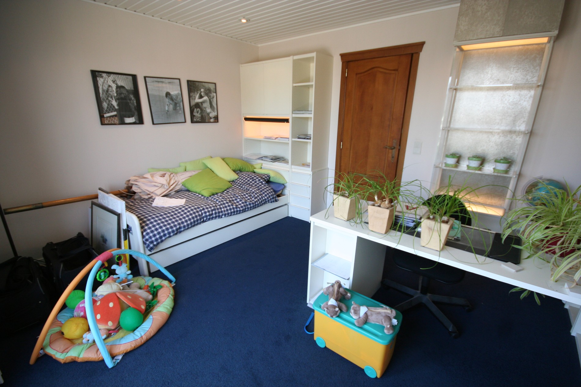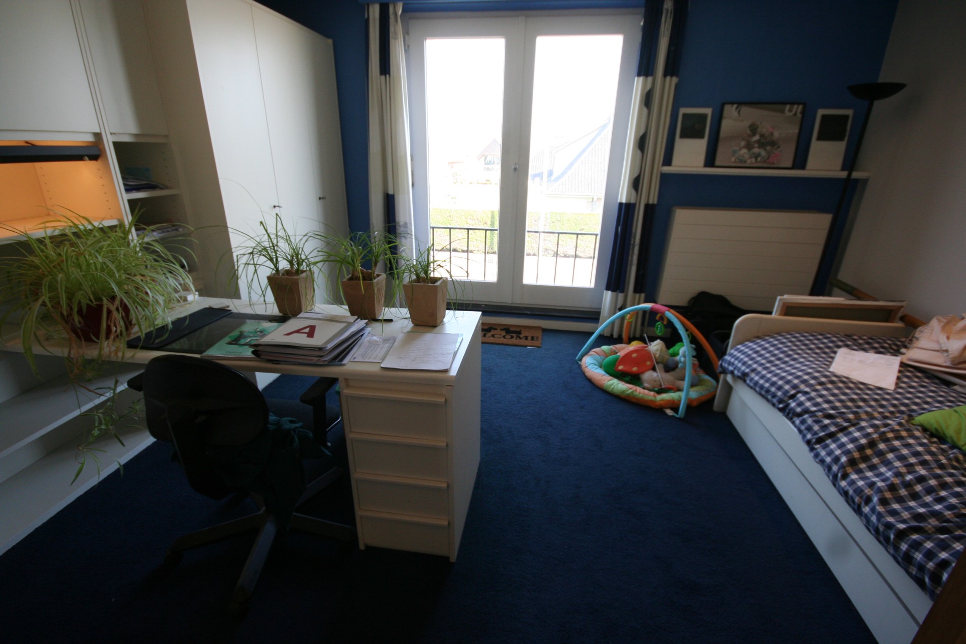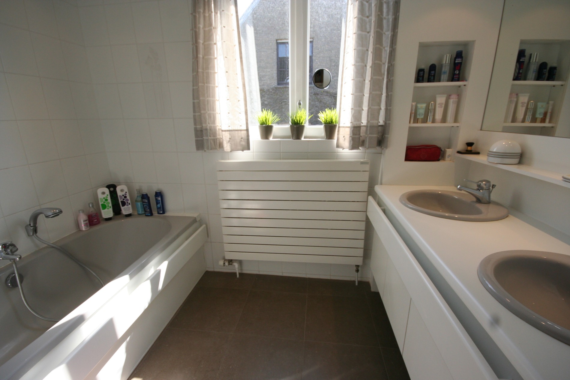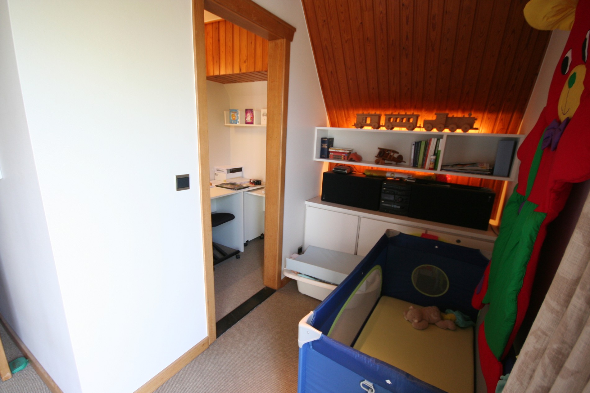 b) verdiepingen: overloop (nieuwe tegelvloer) met zolderluik (+ uitschuifbare trap),- voor-slaapkamer (16 m²),- master-slaapkamer (18 m²),- ingerichte achter-slaapkamer (19 m²),- aansluitende bureau (destijds een badkamer * leidingen + afvoeren zijn voorzien),- toilet,- badkamer met ligbad, toiletmeubel + ingebouwde dubbele lavabo, linnenkast + hemel + spotjes,- en opperzolder ;
