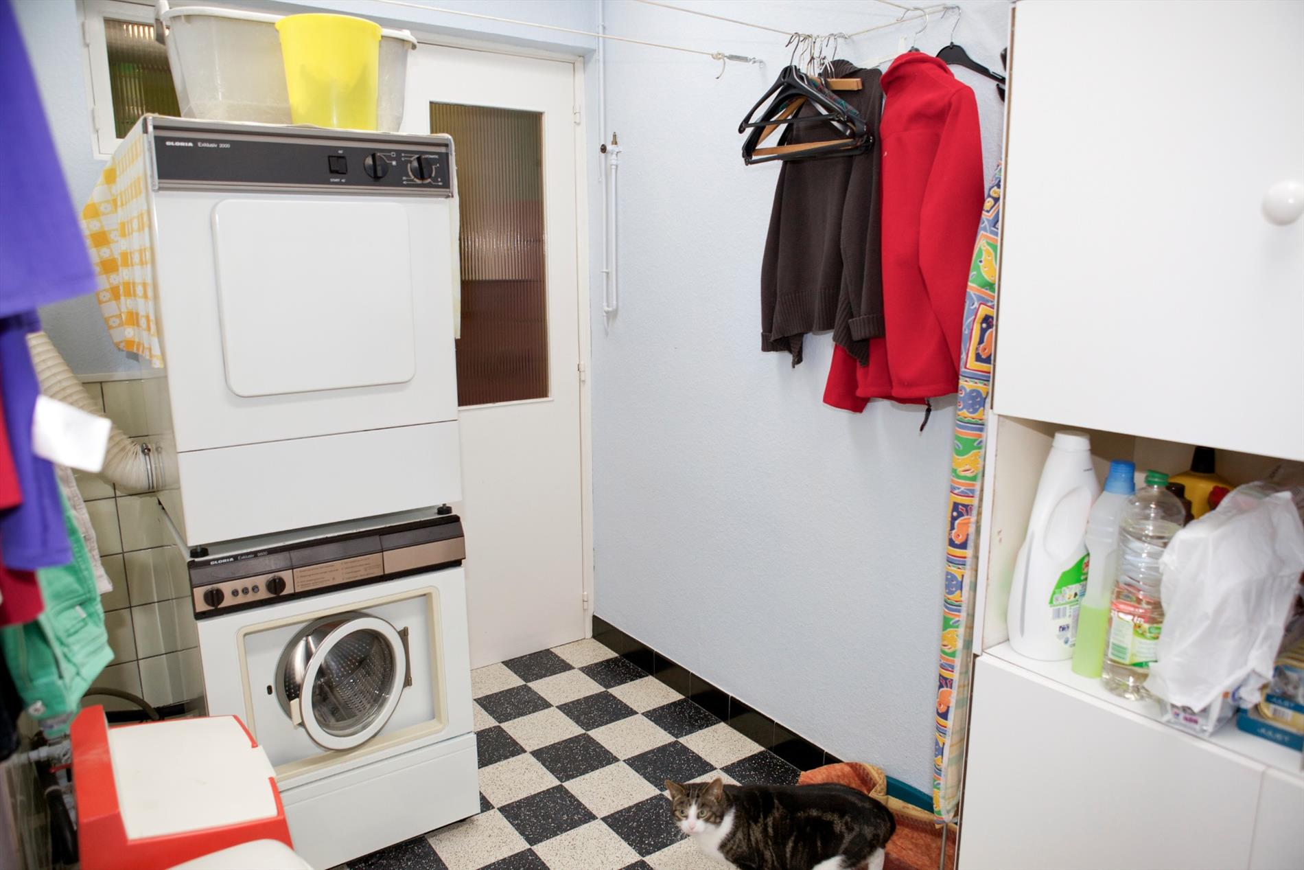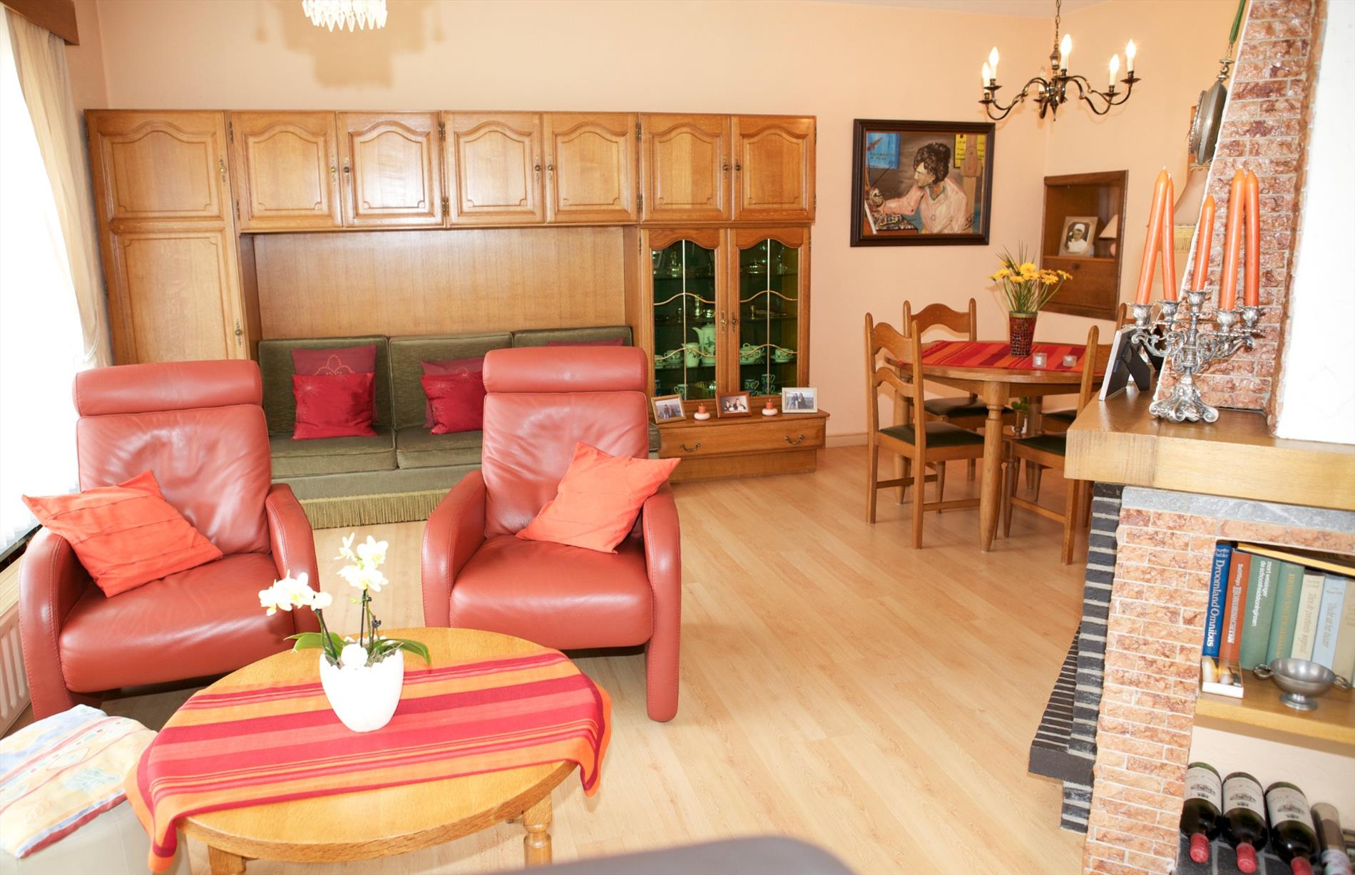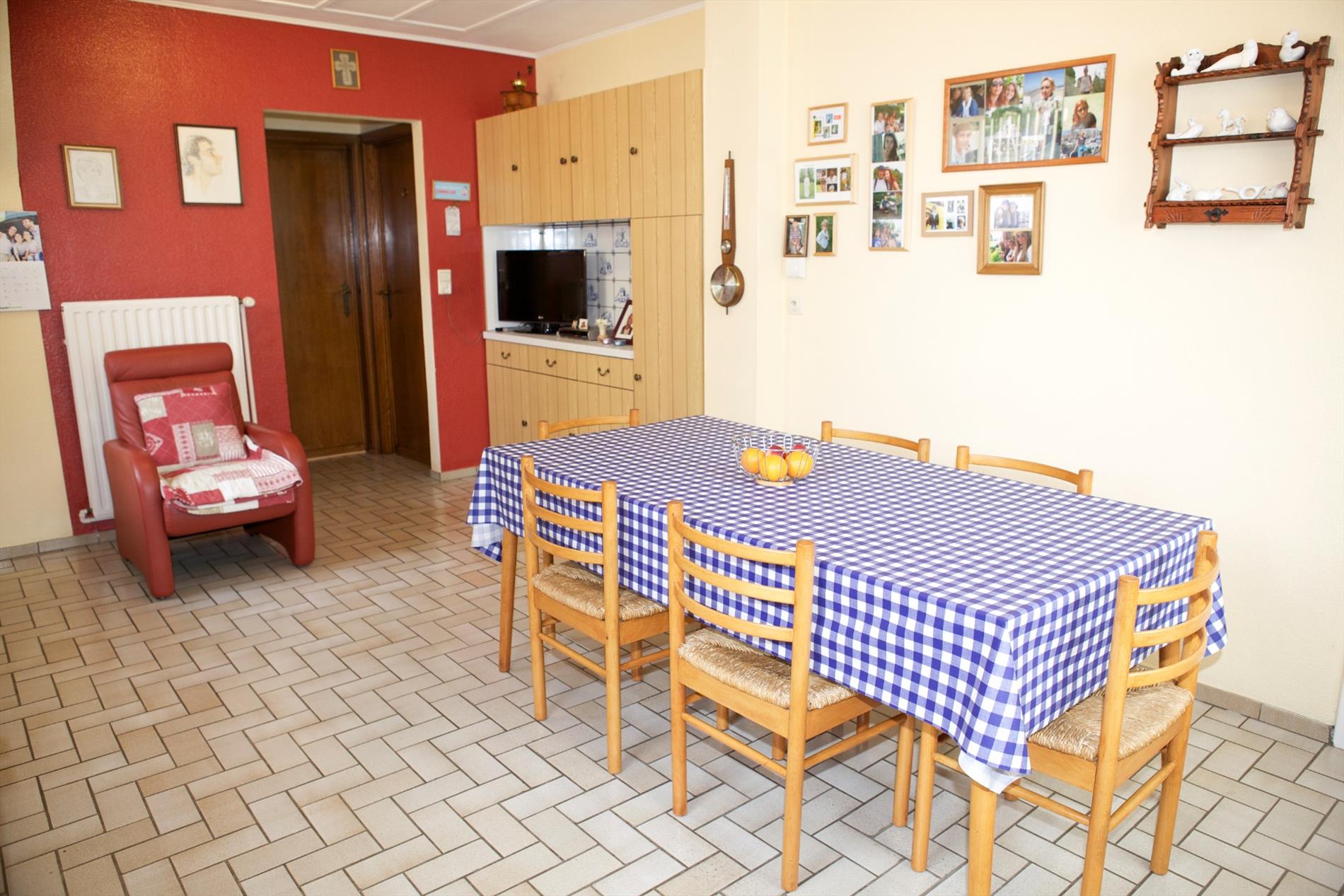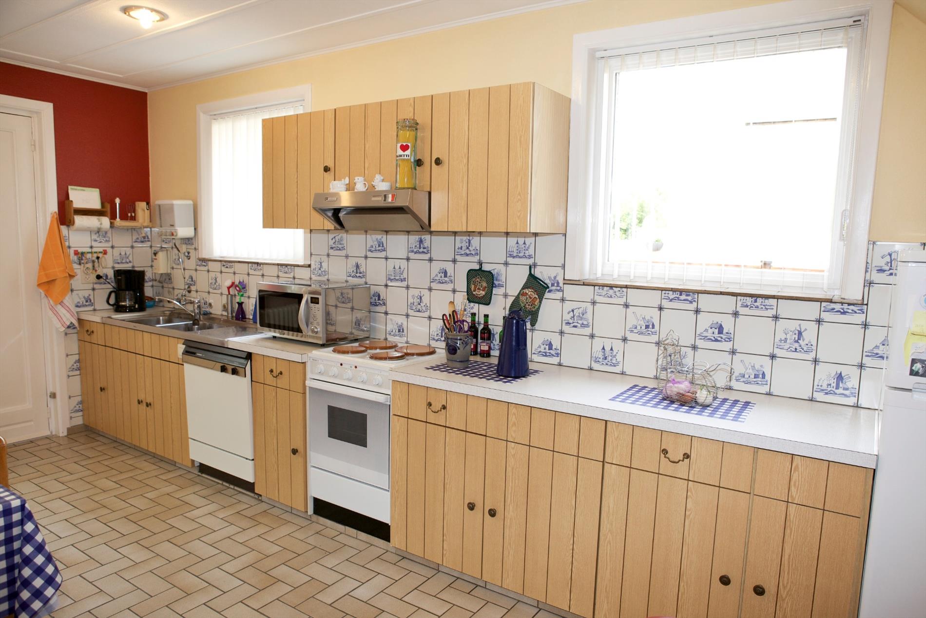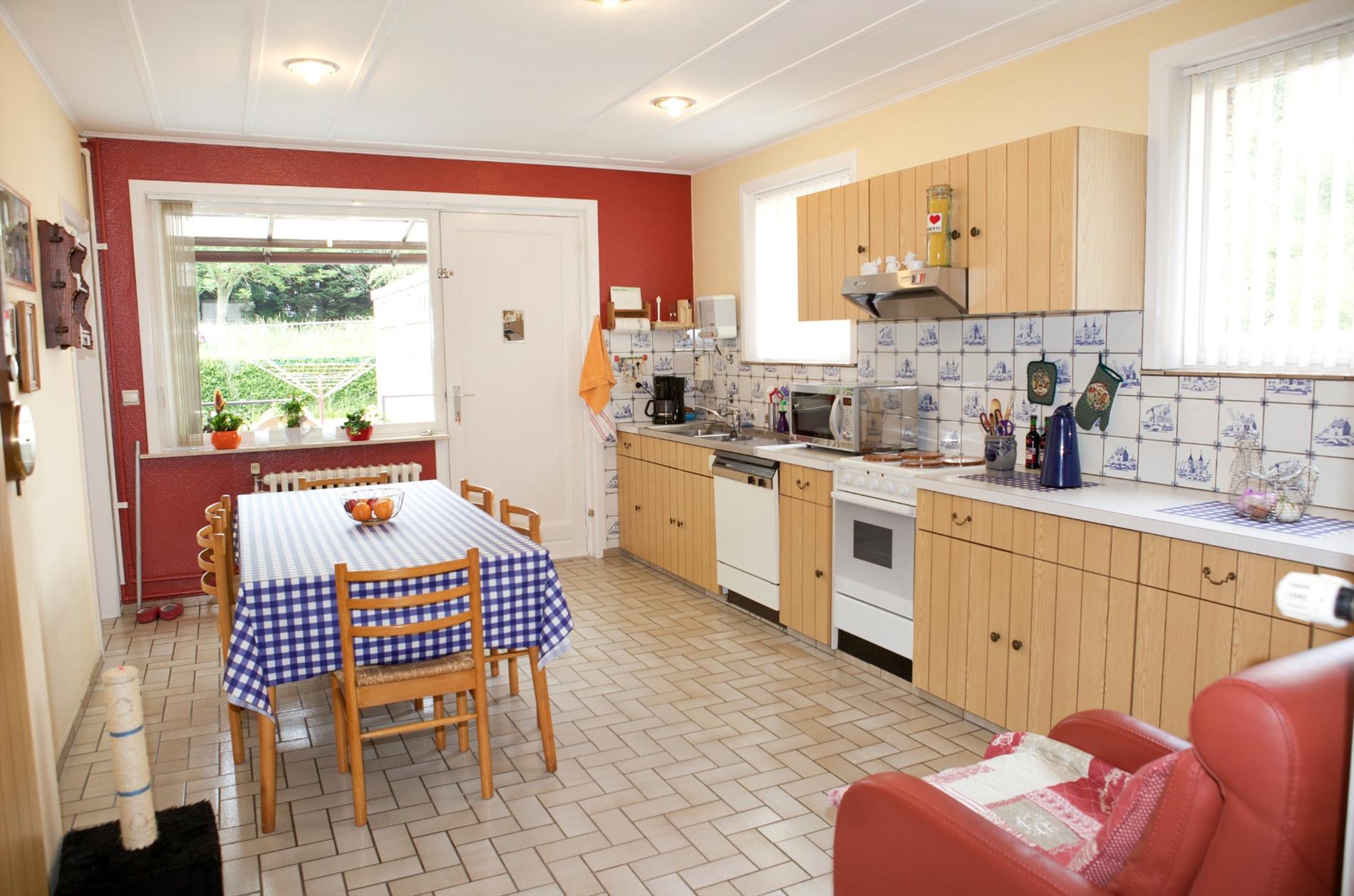 a) gelijkvloers: Voortuintje,- oprit naast de woning,- inkom- en traphal (berging onder de trap),- living (24,77 m²) met open haard en eiken balken,- ruime keuken (17,89 m²) met vaatwasmachine, dubbele inox afwasbak, warm water boiler (5 L), elektrisch kookfornuis, dampkap (Novy) en koelkast (Delftse faience) en 2de keukenblok,- sas,- badkamer (3 x 1,70) met zitbad, toilet en lavabo,- wasplaats met aansluiting voor wasmachine en droogkast,- stookplaats,- groot, nieuw terras,- aparte garage (9,40 x 3,60) met elektrisch bediende poort in PVC en met smeerput,- zonnige tuin;